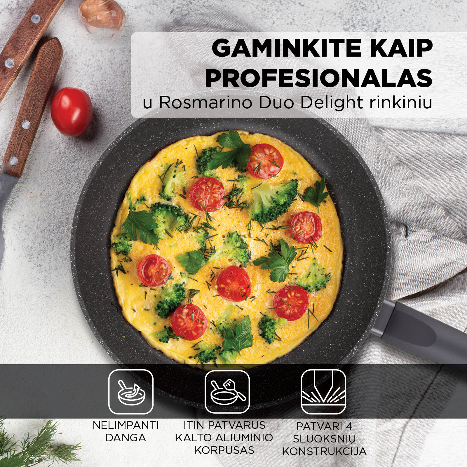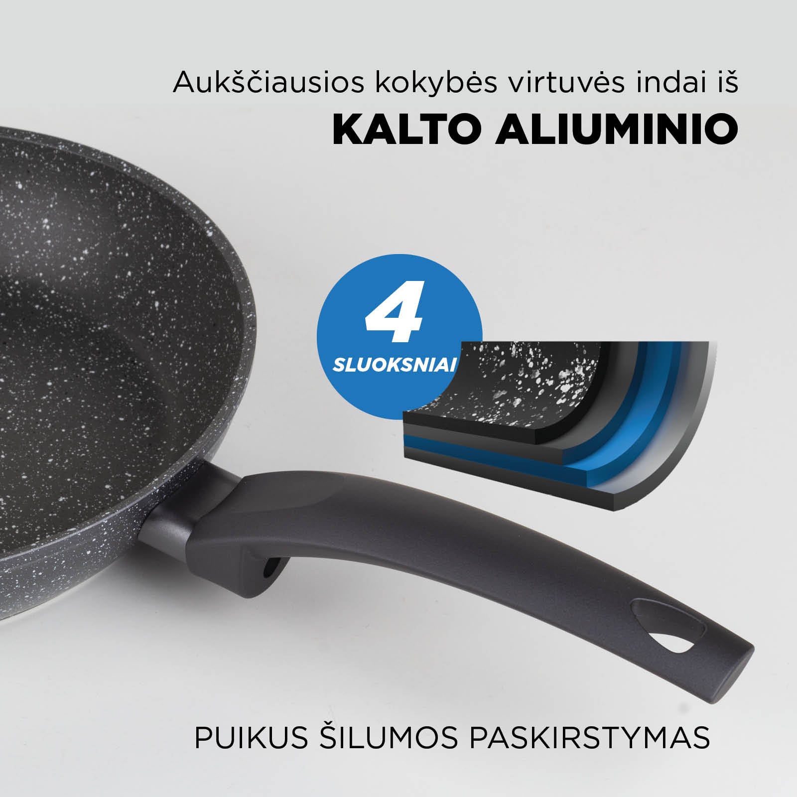 - 2 dalių keptuvių rinkinys, pagamintas iš patvaraus kaltinio aliuminio.