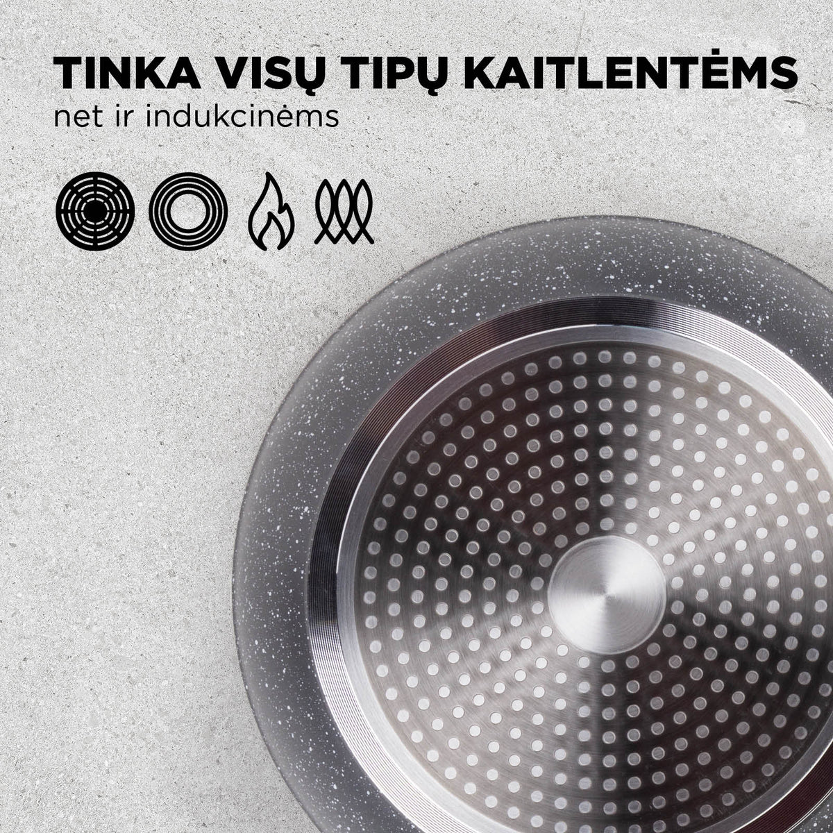 Tinka naudoti ant visų tipų viryklių, įskaitant indukcines.