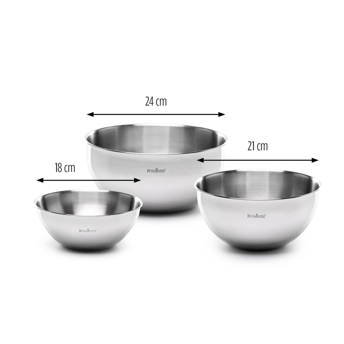 - 3 dalių nerūdijančio plieno maišymo indų rinkinys įvairiems ingredientams maišyti ar maisto produktams laikyti.