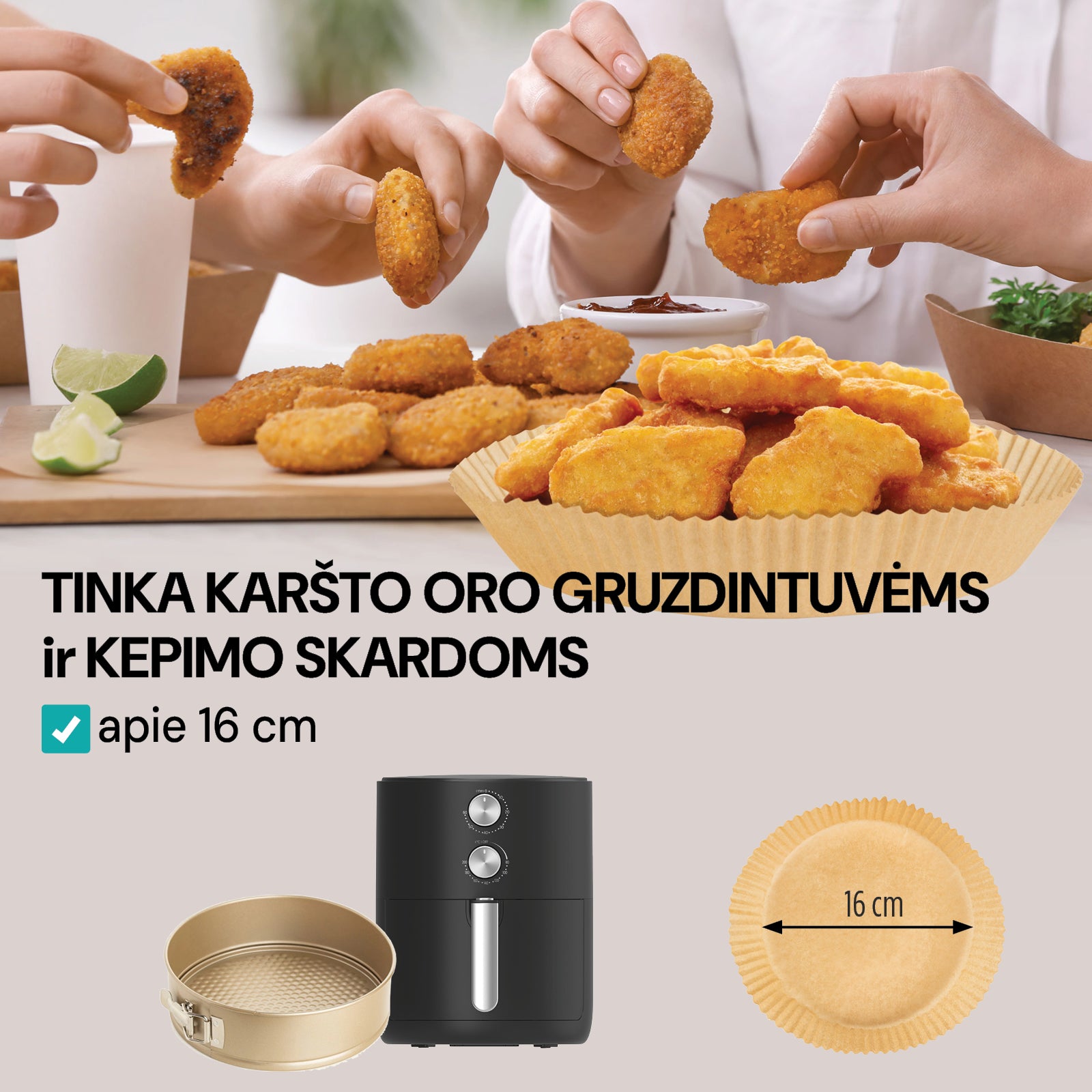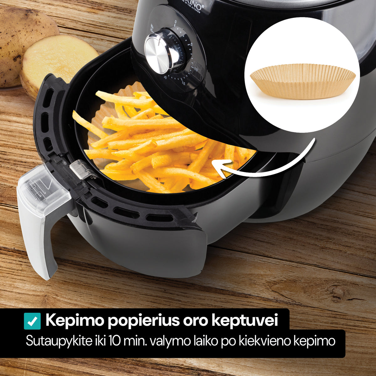 - Kepimo popierius suderinamas su įvairiomis karšto oro gruzdintuvėmis su apvaliu krepšeliu.