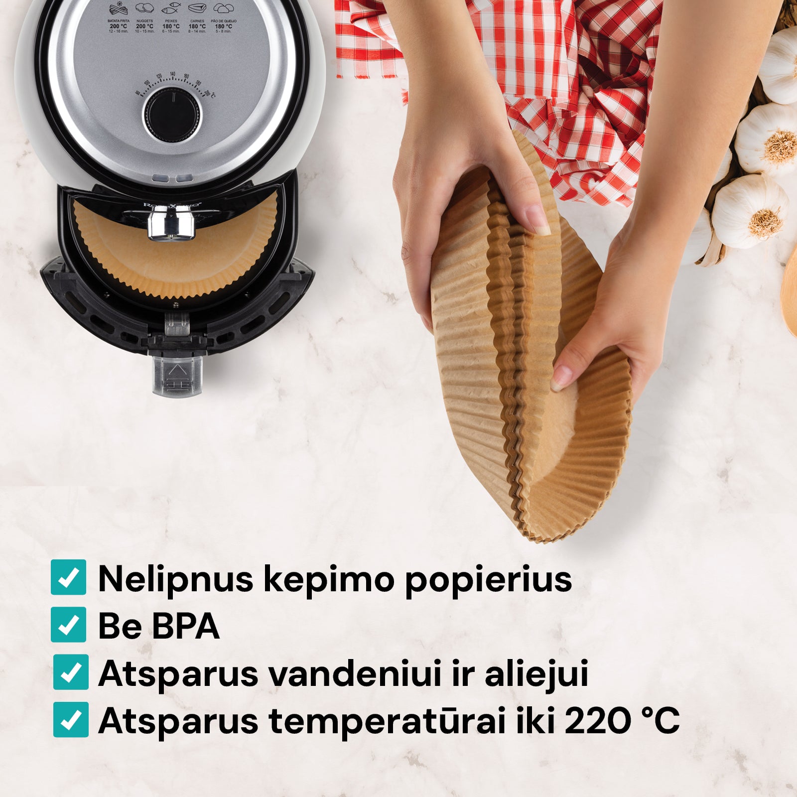 - 50 vnt. kepimo popieriaus, skirto jūsų mėgstamai karšto oro gruzdintuvei.