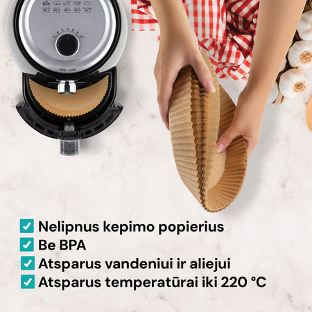 Kepimo popierius, kurio tiesiog negalite praleisti pro akis. Šį kepimo popieriaus rinkinį būtina turėti savo karšto oro gruzdintuvei. Pasiruoškite lengvesniam maisto gaminimui ir tikrai paprastam valymui. Naudodami šį kepimo popierių galėsite išlaisvinti savo kulinarinę fantaziją, nesirūpindami, kad po kiekvieno naudojimo tektų sunkiai valyti.