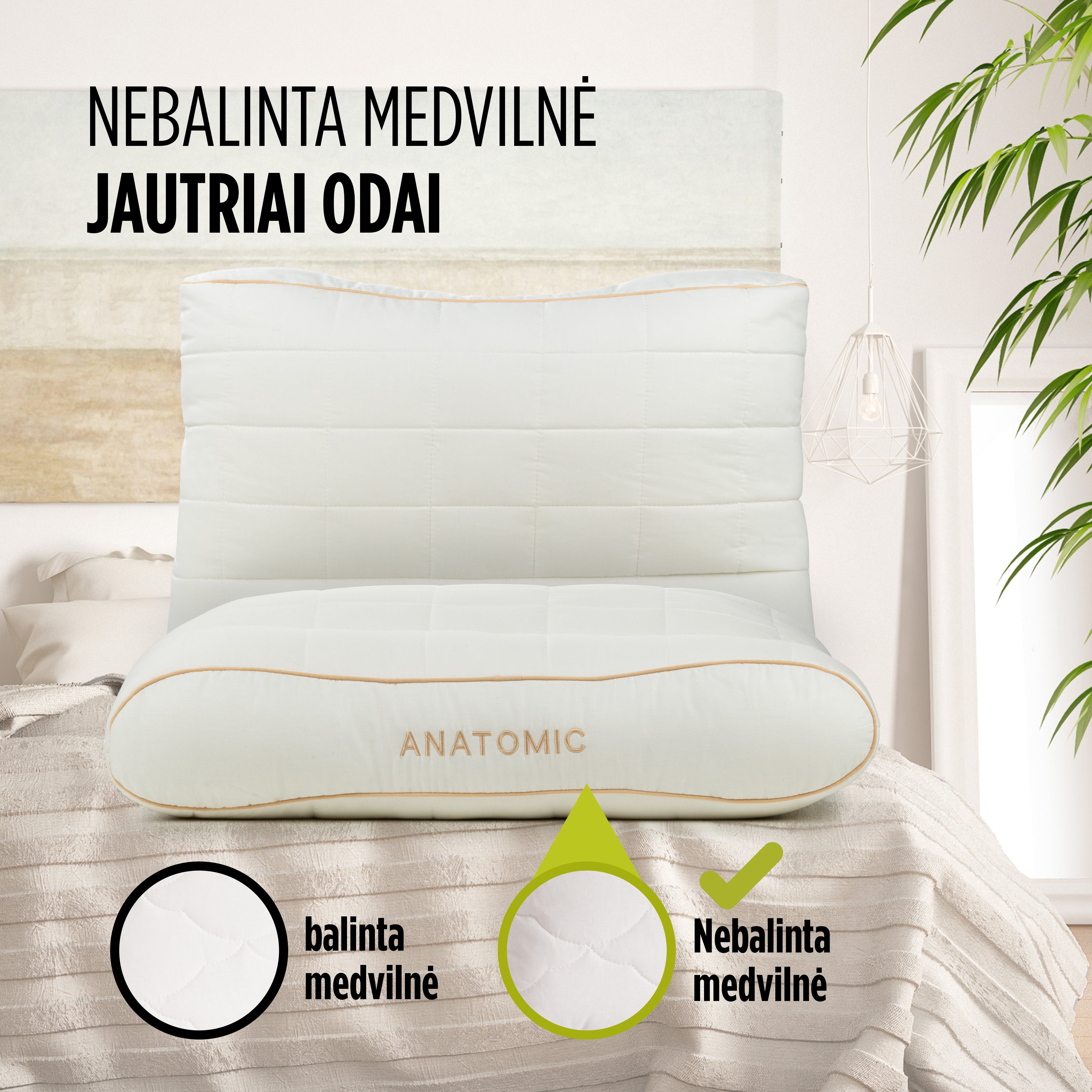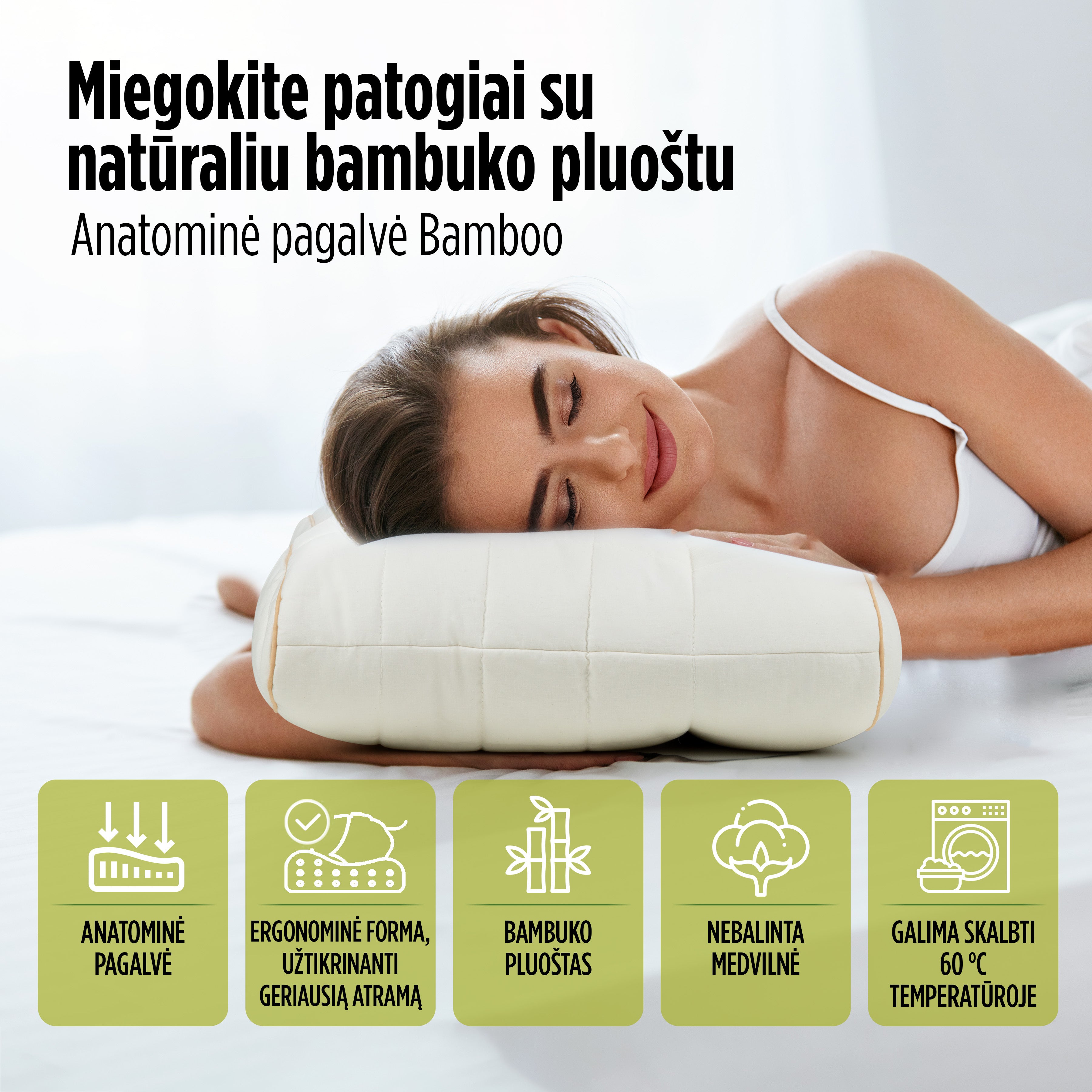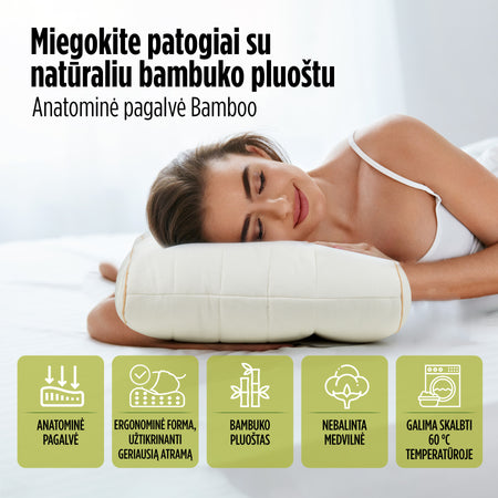 Anatominė pagalvė suteiks puikią atramą kaklui. Tinkama visoms miego padėtims. Užvalkale naudojamas nebalintos medvilnės ir natūralaus bambuko pluošto derinys tinka net jautriausiai odai. Pagalvė tinka visiems, nes ją galima reguliuoti pagal norimą aukštį ir kietumą.