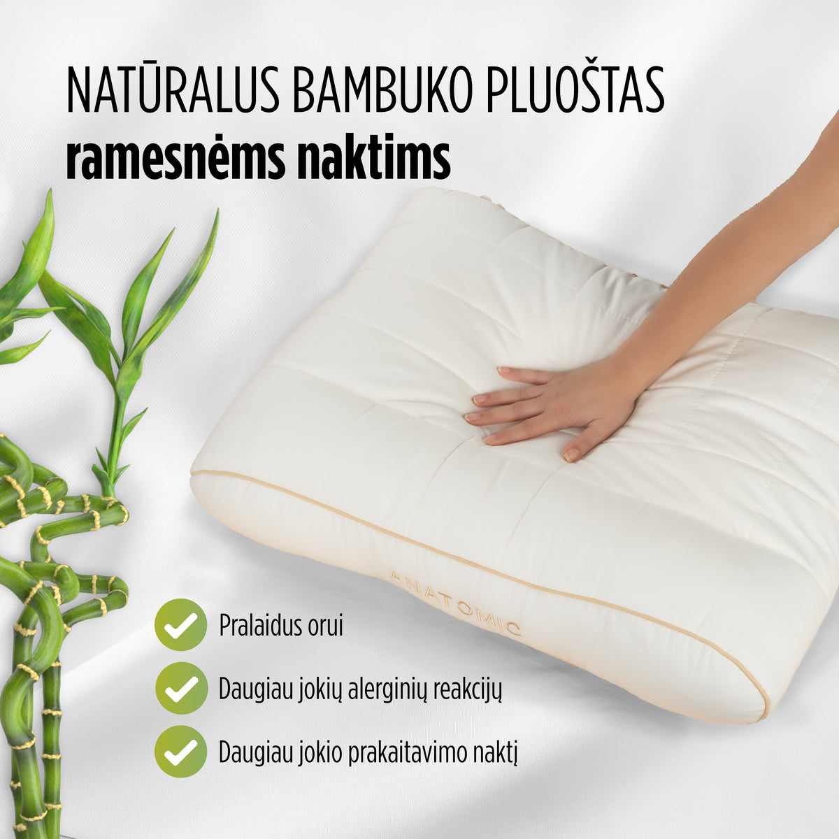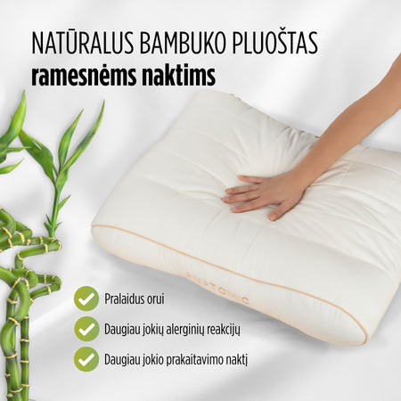 Ant bambuko anatominės pagalvės kiekvienas kaklo slankstelis bus taisyklingoje ir tinkamoje padėtyje. Kad ir kokioje miego padėtyje miegotumėte, jūsų miegas bus kaip niekada ramus ir gilus, o kaklo skausmas taps praeitimi. Dėl savo aukščio pagalvė tinka ir platesnių pečių žmonėms.