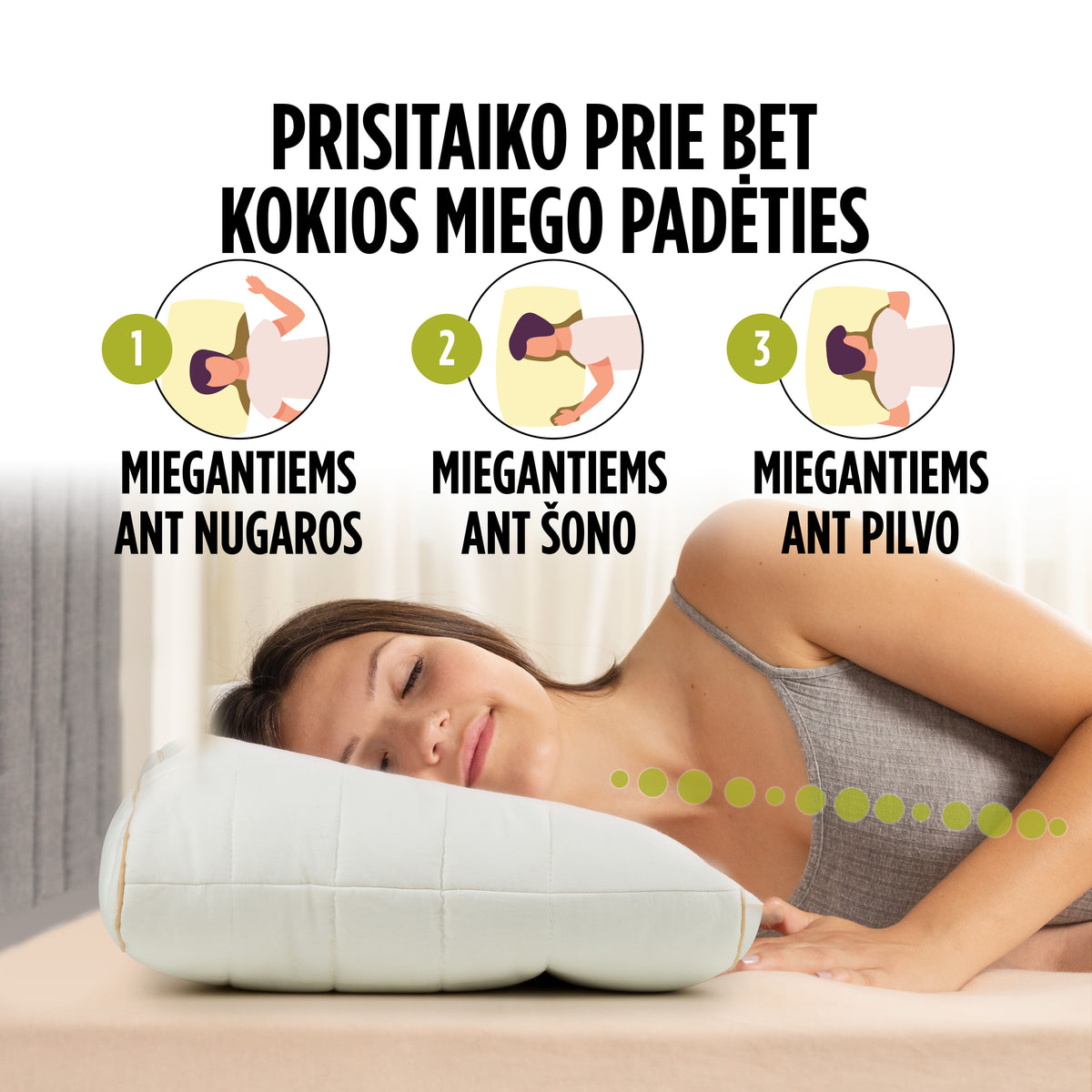 - Tinka visoms miego padėtims: ant nugaros, šono ir net ant pilvo. Taip pat puikiai tinka žmonėms su platesniais pečiais, kuriems reikia tinkamai aukštos pagalvės.