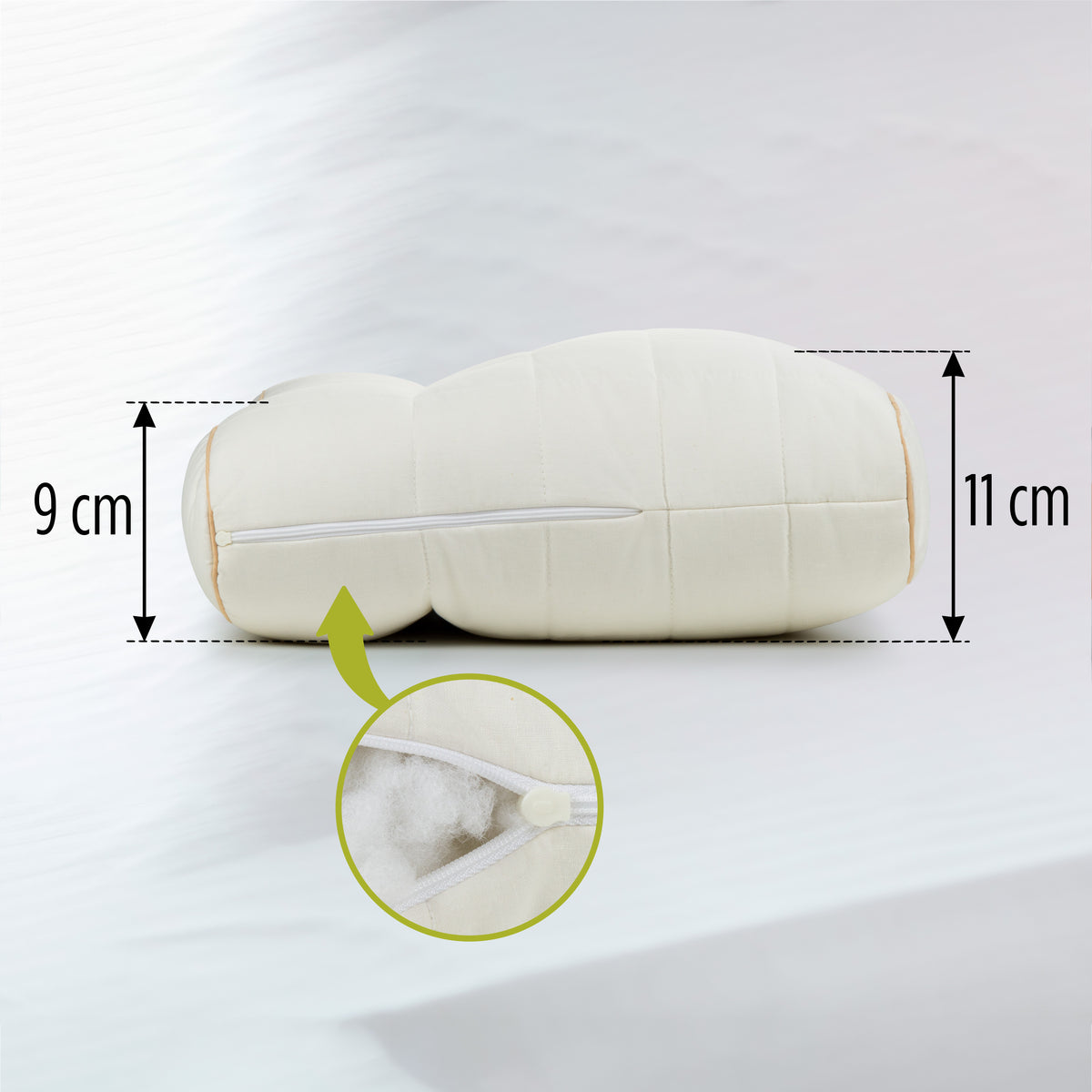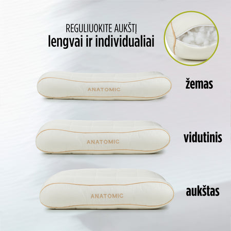 Norėdami reguliuoti pagalvės aukštį ir kietumą, išimkite arba pridėkite užpildą. Taip galėsite pritaikyti pagalvę prie savo miego padėties ir atsisveikinti su kaklo skausmais.