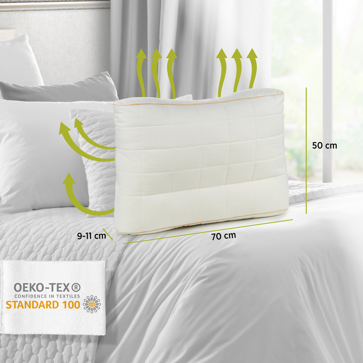 - Pagalvę galima skalbti 60 °C temperatūroje, todėl ji tinka ir tiems, kurių oda jautri ir problemiška, kenčiantiems nuo alergijos ir astmatikams.