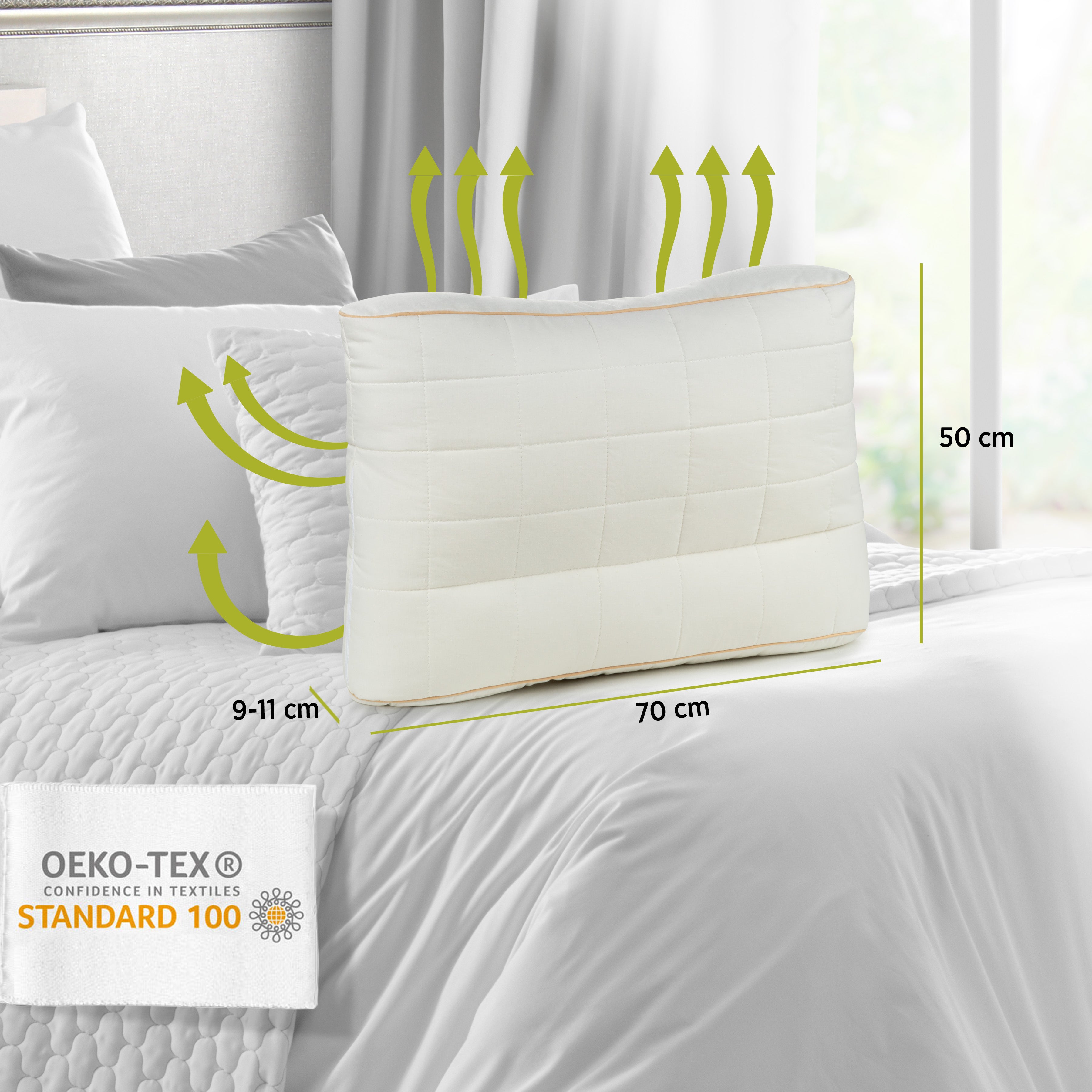 Pagalvėje nėra kenksmingų cheminių medžiagų, todėl ji yra palankesnė odai ir nesukelia alerginių reakcijų. Užvalkalas pagamintas iš nebalintos medvilnės, kuri yra švelnesnė ir visiškai nekenksminga, palyginti su tradiciniais medvilniniais audiniais. Nebalintą medvilnę galima atpažinti iš mažų juodų taškelių, kurie būdingi jos natūraliai išvaizdai.