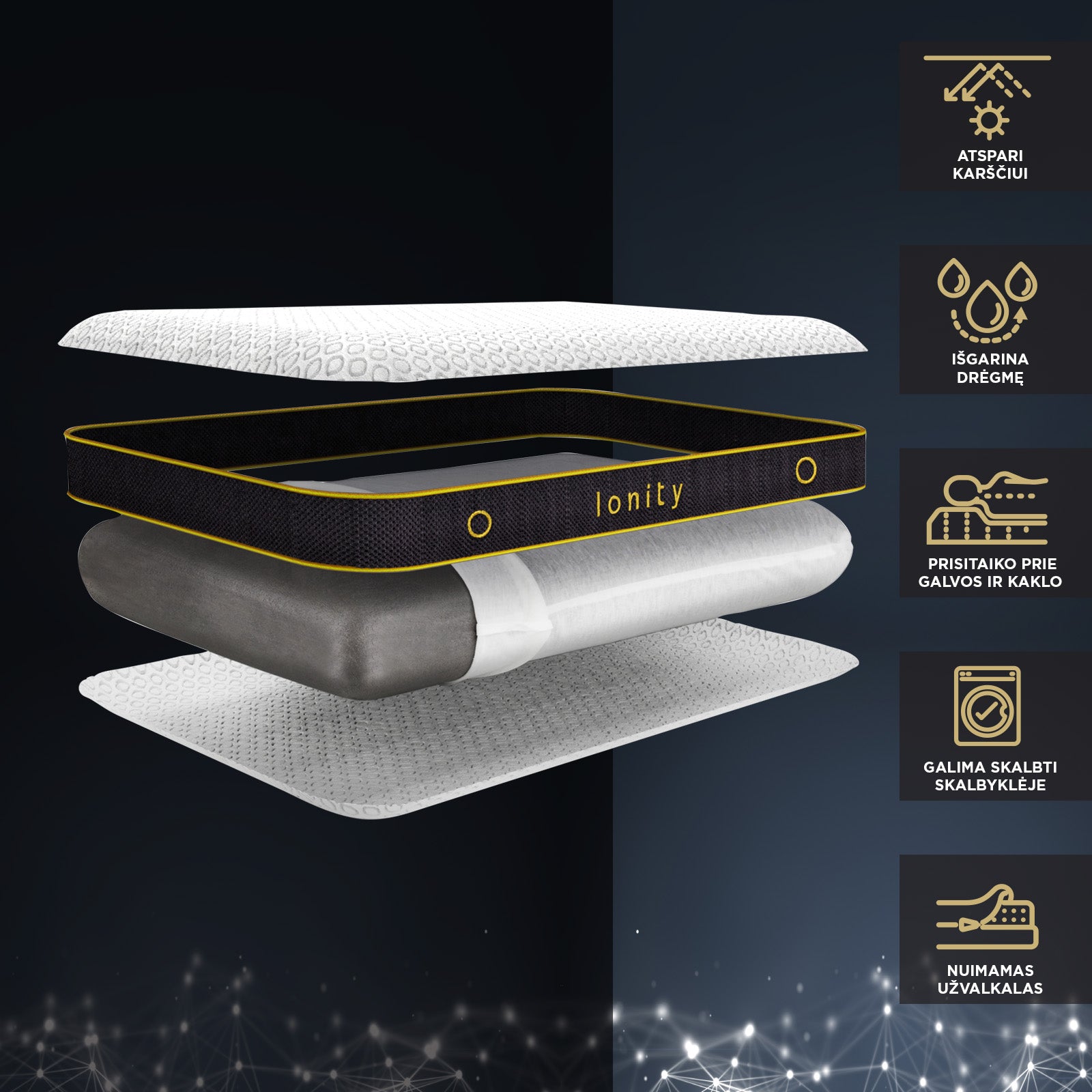 Ionity anatominė pagalvė sumažina kaklo skausmą ir palaiko taisyklingą bei patogią stuburo padėtį. Atminties putos puikiai apglėbia pečius ir kaklą ir atpalaiduoja visus kaklo raumenis miegant. Pridėta bambuko medžio anglis sugeria drėgmės perteklių, kurį jūsų kūnas išskiria kiekvieną naktį miegant. Todėl su Ionity pagalve jūsų naktys bus gaivesnės ir ramesnės, toli nuo prakaito akimirkų. Ionity pagalvės užvalkalas praturtintas sidabro jonais, kurie teigiamai veiks jūsų miegą. Sidabro jonai mažina alergijos, odos sudirgimo priežastis ir labai padeda išvengti bakterijų atsiradimo bei mažina jų kiekį.
