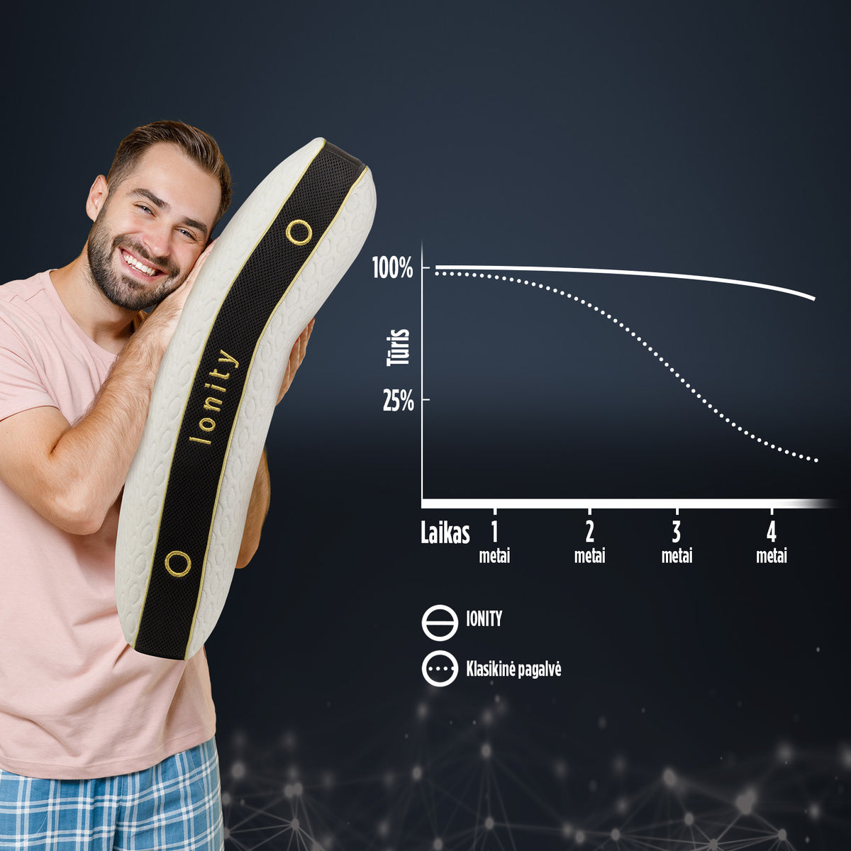 Geras miegas yra pirmoji prielaida, kad būtumėte pailsėję, sveiki ir energingi visą dieną. Ionity yra daugiau nei tik pagalvė. Tai aukščiausios kokybės pagalvė, sukurta naudojant naujausias medžiagų technologijas. Ionity užtikrins geriausią komfortą be kaklo skausmo ir ergonomišką atramą su išlygintu stuburu.