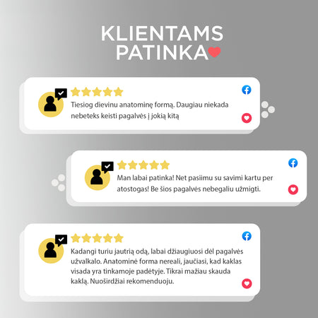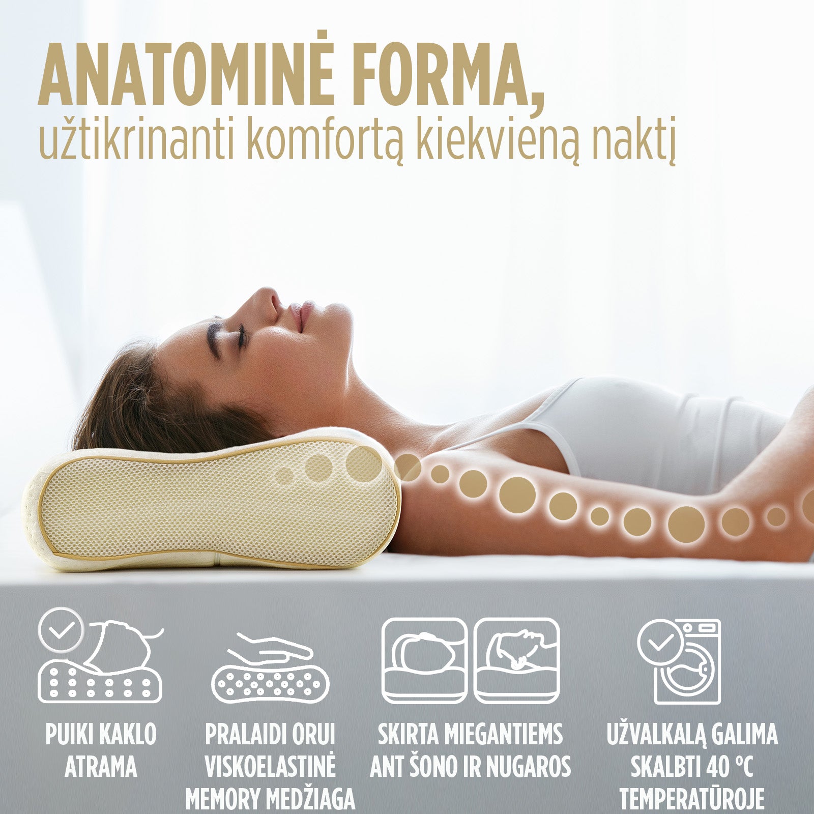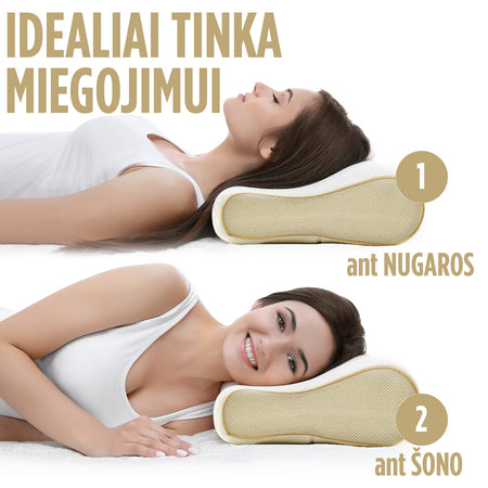 - Anatominė pagalvė puikiai tinka miegoti ant šono arba nugaros.