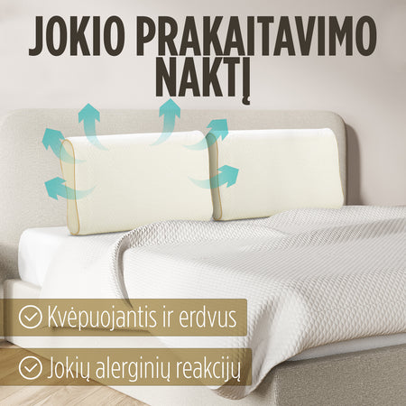 - Dėl korėtos struktūros prisitaikančio pluošto pagalvė greitai išdžiūsta. Idealiai tinka tiems, kurie prakaituoja miegodami ir nori sausos miego aplinkos.