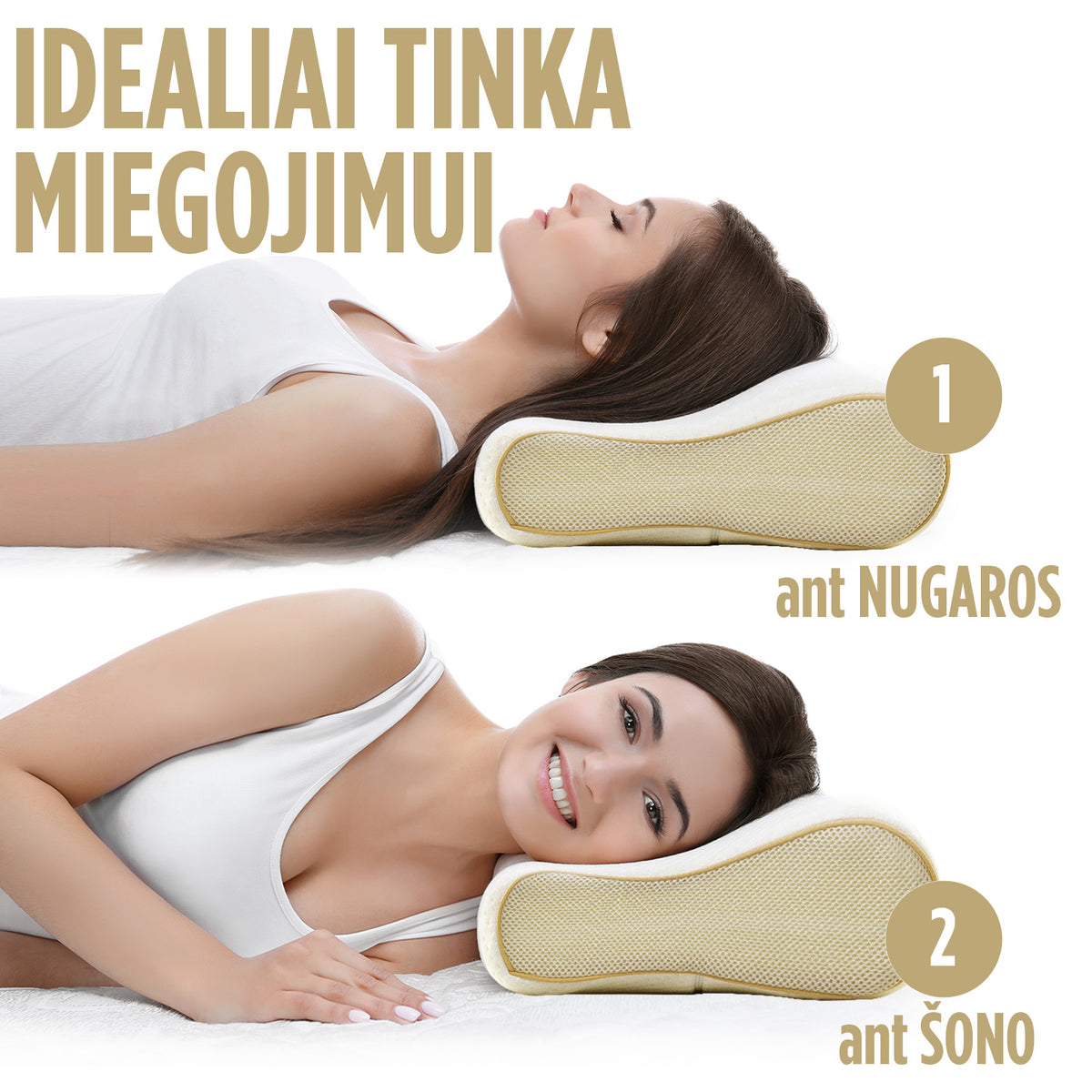 Pagalvė tinka patogiam miegui ant šono ir nugaros. Gulint ant šono stuburas yra tiesios linijos formos, o gulint ant nugaros – S formos.