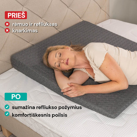 - Klinės formos pagalvė padeda sumažinti refliuksą ir kvėpavimo problemas miegant, taip pat sumažina knarkimą.