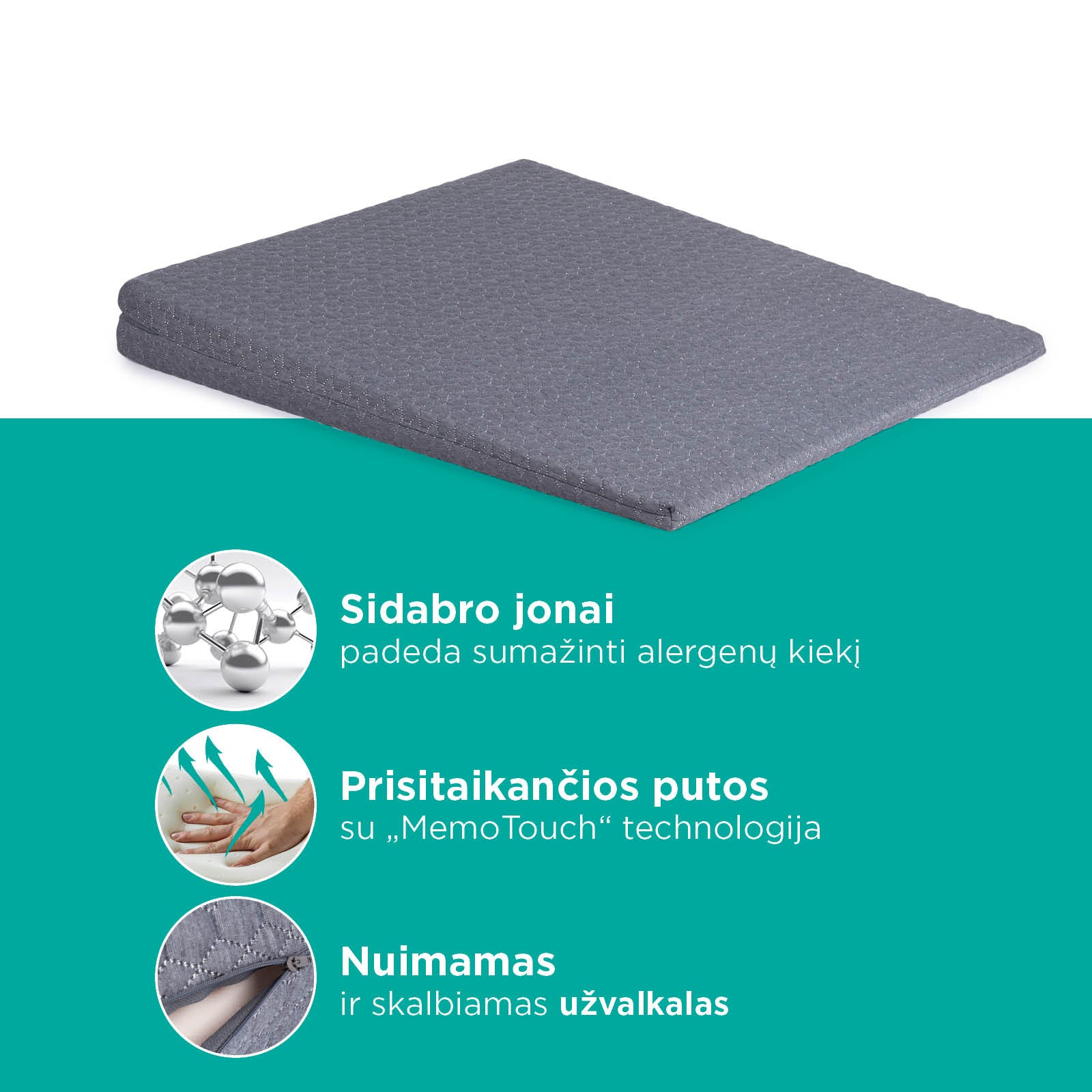- Sidabro jonais praturtintas užvalkalas padeda slopinti bakterijų augimą, mažindamas alergijų ir odos dirginimo riziką.