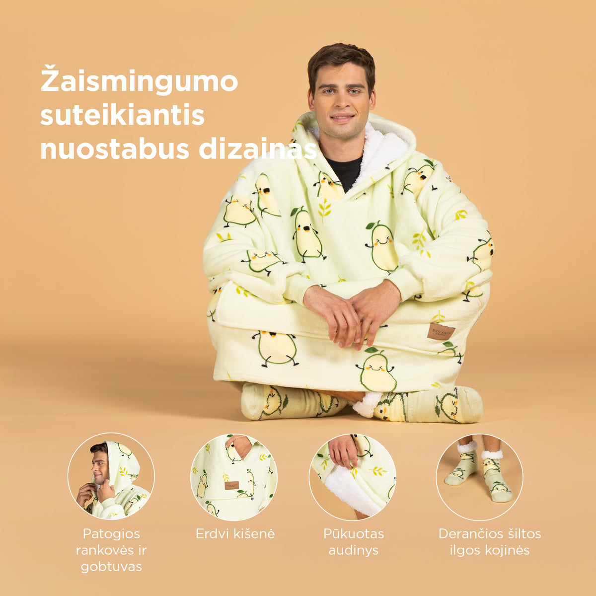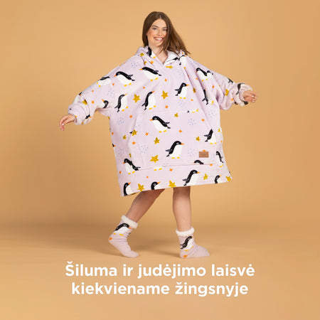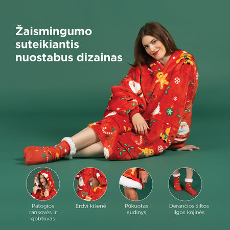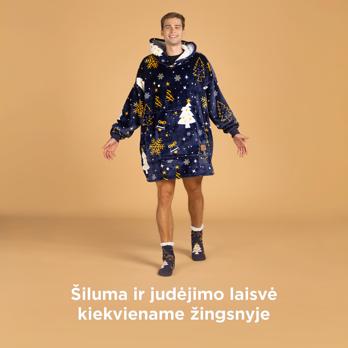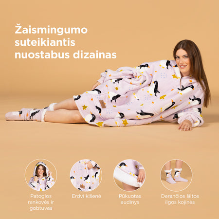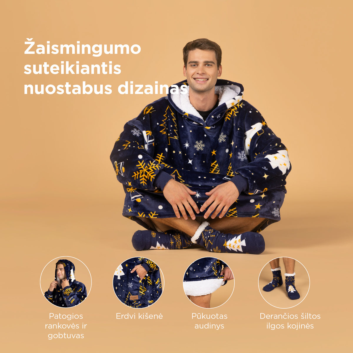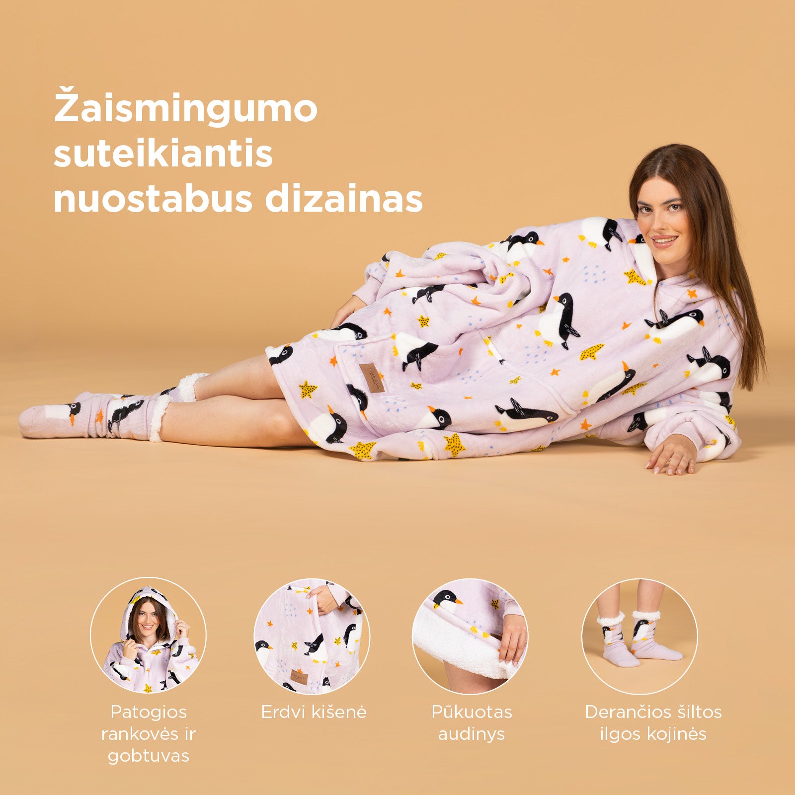 - Dovana: šiltos kojinės su neslystančia apsauga tokiu pačiu dizainu kaip ir antklodė su gobtuvu.
