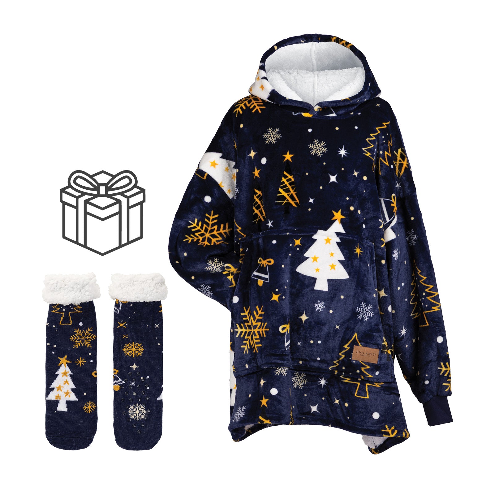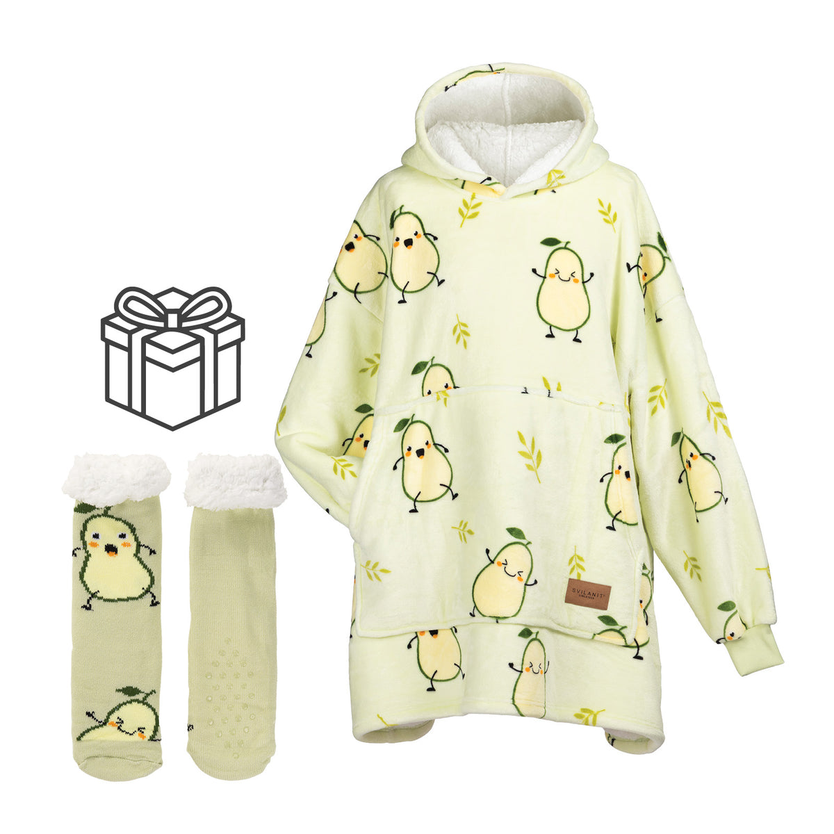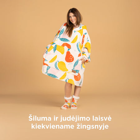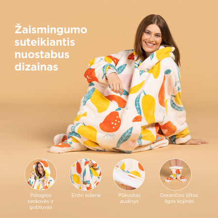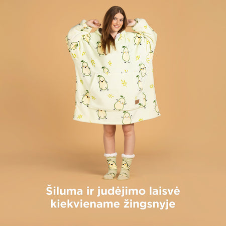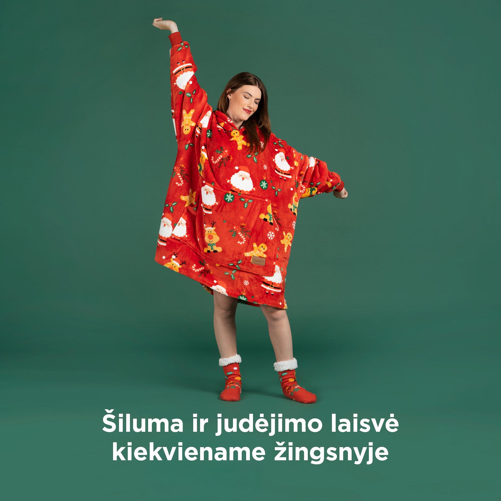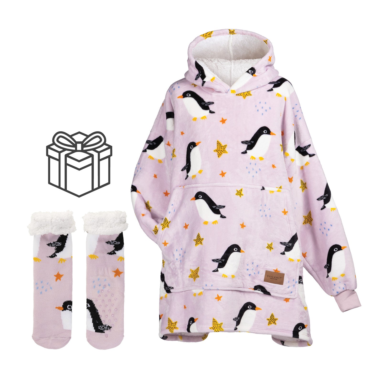 - Dovana: šiltos kojinės su neslystančia apsauga tokiu pačiu dizainu kaip ir antklodė su gobtuvu.