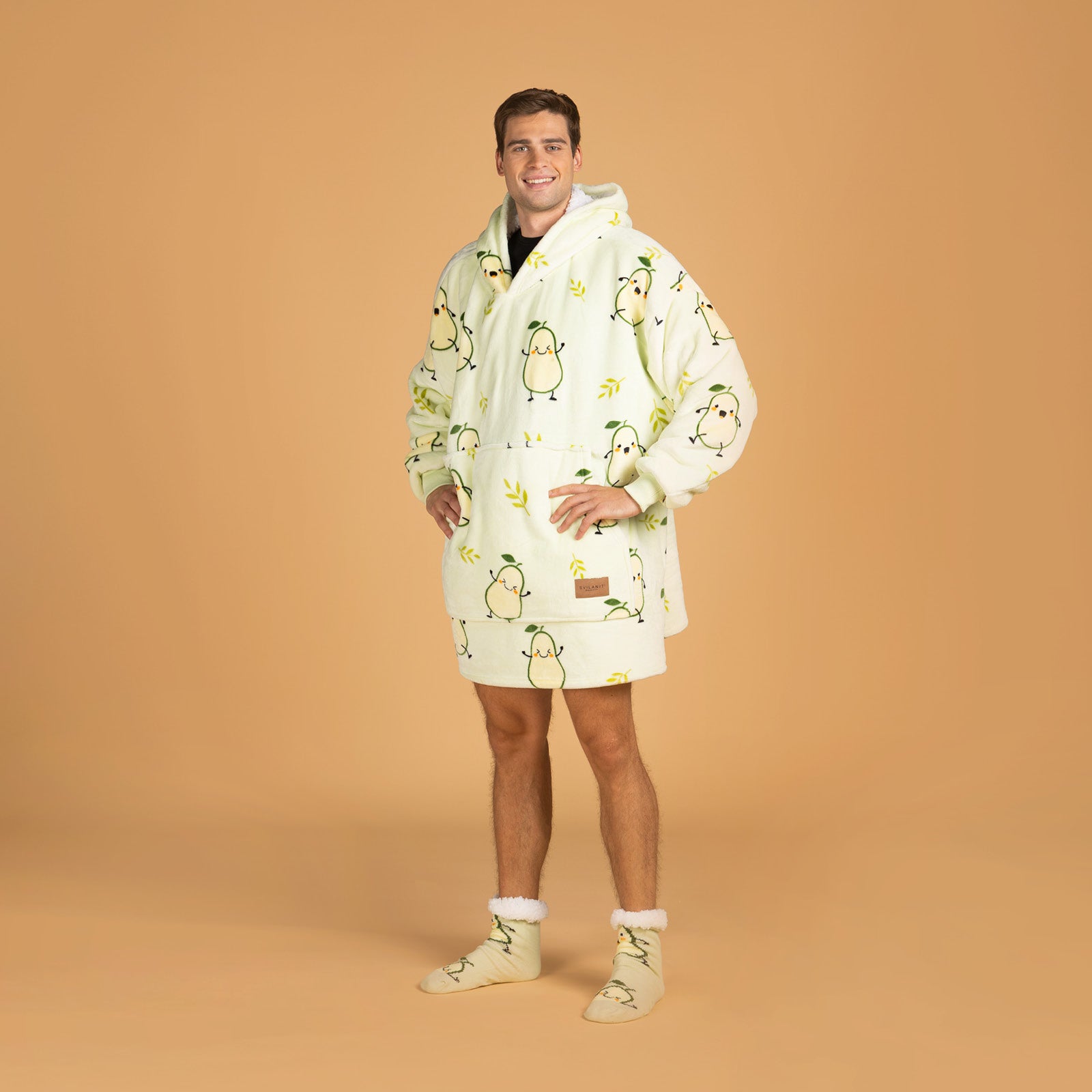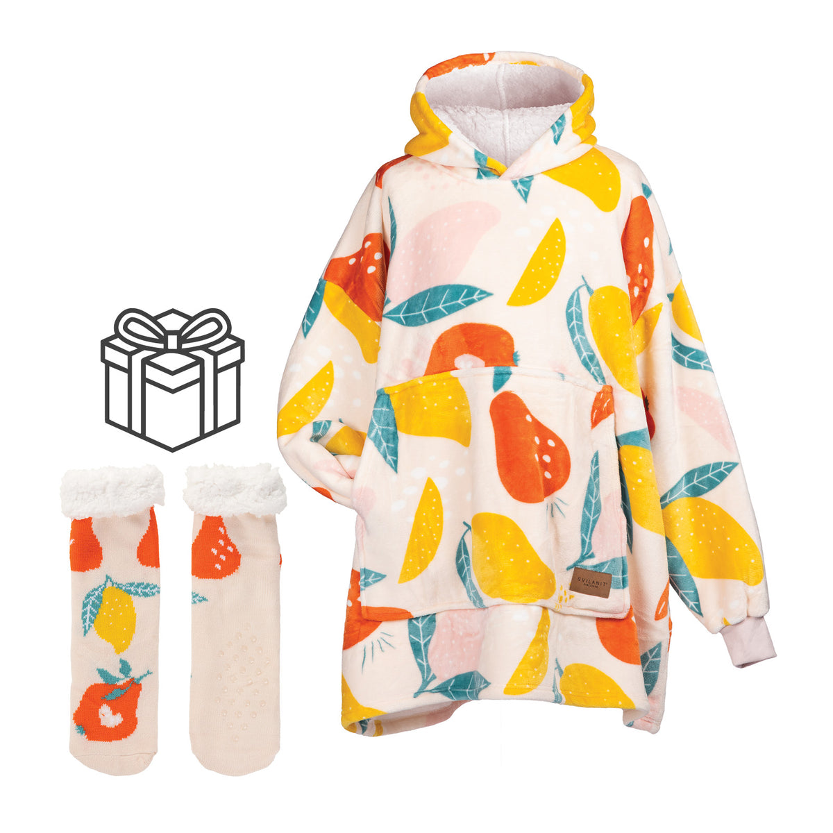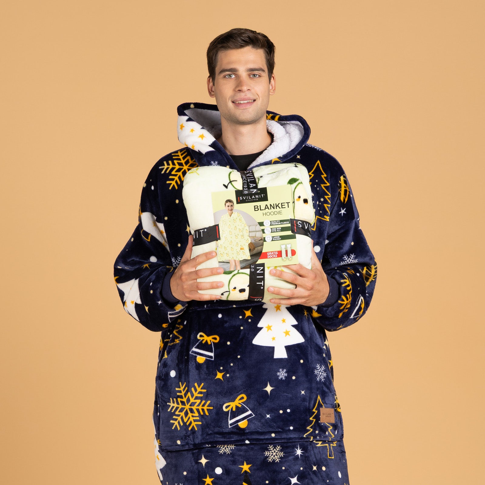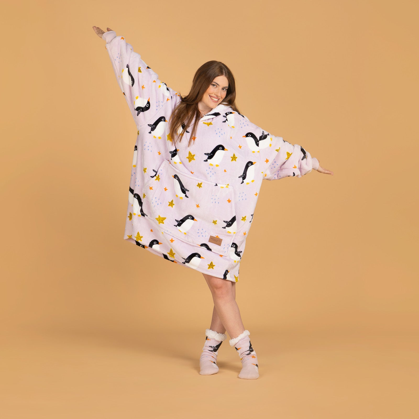 - Dovana: šiltos kojinės su neslystančia apsauga tokiu pačiu dizainu kaip ir antklodė su gobtuvu.