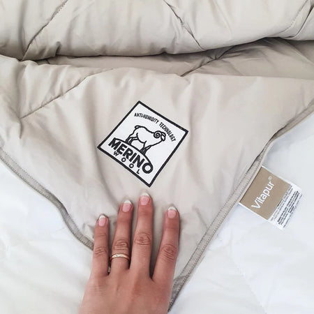 Dviejų sluoksnių antklodę galite apsukti pagal savo poreikius. Viršutinis sluoksnis su merino vilna pašalina drėgmę ir palaiko komfortišką temperatūrą visą naktį. Ji puikiai tinka skirtingiems metų laikams – vasarą maloniai vėsina, o žiemą šildo. Apatinis sluoksnis su ekologiška alternatyva pūkams suteikia antklodei prabangos, purumo ir išskirtinio švelnumo pojūtį. Šie itin ploni mikropluoštai yra geriausia alternatyva pūkams ir užtikrina pažįstamą purią šilumą bei jaukumą.
