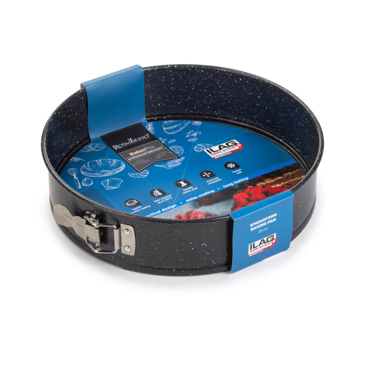 Apvali „Rosmarino BakerPRO“ kepimo forma yra viskas, ko reikia tobulam pyragų, biskvitų, pyragų ar kitų kepinių kepimui. Marmurinės išvaizdos keptuvė turi nuimamą kraštą su nerūdijančio plieno fiksatoriumi, leidžiančiu lengvai atidaryti ir uždaryti keptuvę bei greitai nuimti kraštą. Šveicariškos kokybės neprideganti ILAG danga užtikrina tolygų šilumos paskirstymą ir kepimą su minimaliu riebalu kiekiu, nes maistas neprilimpa prie keptuvės. Dėl anglinio plieno sudėties keptuvė taip pat atspari aukštai temperatūrai, iki 230°C; tinkama laikyti šaldytuve ir šaldiklyje. Patvarus ir patikimas dizainas profesionaliems kepimo rezultatams.