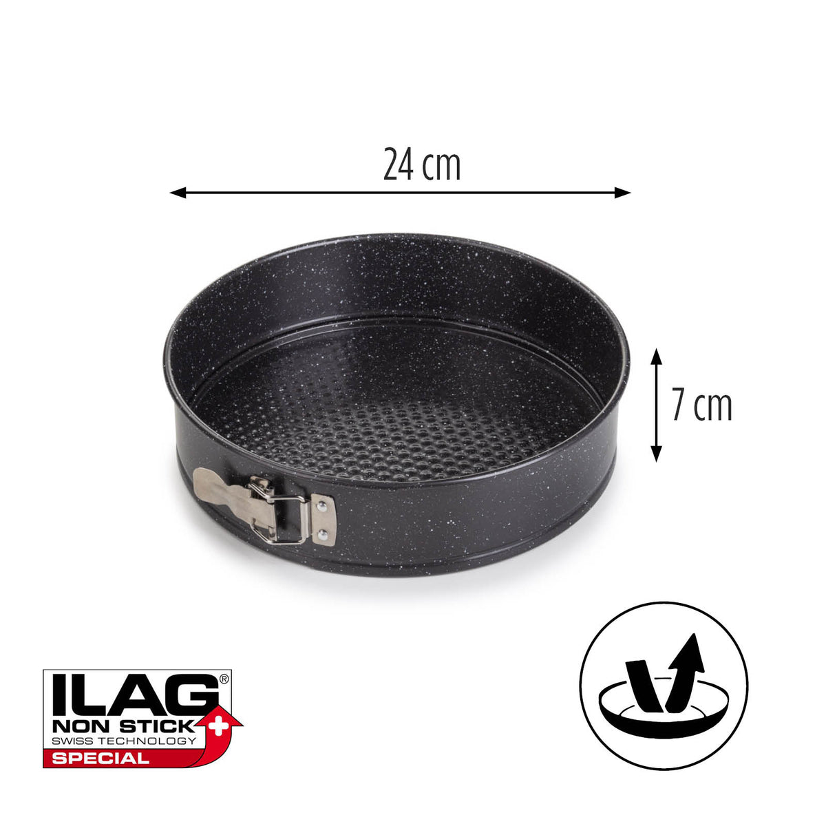 Ar kepdami pyragą nuolat nerimaujate, ar biskvitas gražiai iškeps ir lengvai jį išimsite iš formos? Pamirškite tuos rūpesčius! Keptuvė padengta specialia nepridegančia šveicariškos kokybės ILAG danga. Tai užtikrina, kad pyragą galėsite lengvai išimti iš formos. Danga be kenksmingų medžiagų, saugi naudoti su maistu, atspari įbrėžimams, užtikrina ilgą keptuvės tarnavimo laiką.