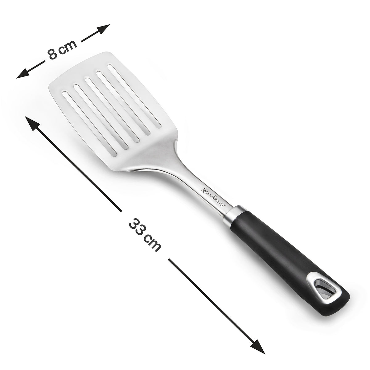 Rosmarino Classic plienis apvertiklis puikiai tinka greitai ir lengvai apversti kiaušinius, blynus, skrebučius, kepsnius arba patiekti įvairius patiekalus. Pagamintas iš patvaraus ir tvirto nerūdijančio plieno. Patogi rankena užtikrina lengvą sukibimą, o papildoma rankenos dalis leidžia lengvai laikyti. Panaudoję tiesiog nuplaukite po tekančiu vandeniu arba įdėkite į indaplovę. Gaminimas su Rosmarino Classic įrankiais bus profesionalus ir smagus tuo pačiu metu!