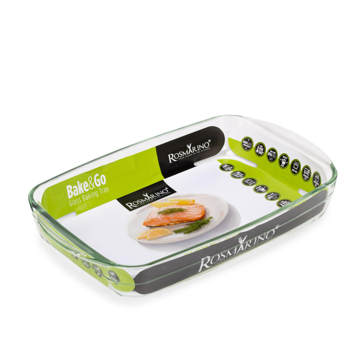 Naujoviškos išvaizdos Rosmarino Bake&Go stiklinė kepimo skarda (3600 ml) bus jūsų naujas nepamainomas kepimo indas. Dėl borosilikatinio stiklo sudėties stačiakampė kepimo skarda taip pat yra atspari aukštai temperatūrai orkaitėje arba mikrobangų krosnelėje, šaldytuve ir plaunama indaplovėje. Idealiai tinka lazanijai, gratenams, mėsai, žuviai, pyragams, daržovėms ar kitiems patiekalams ruošti.