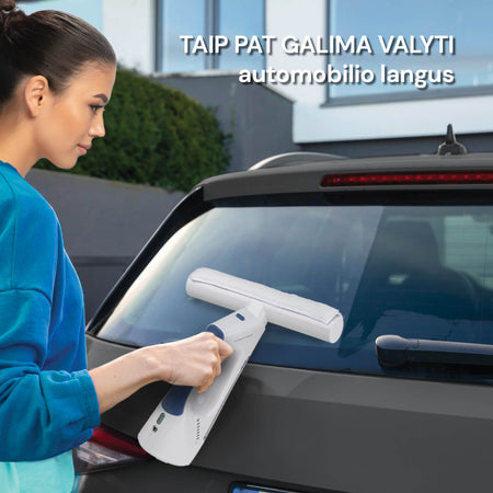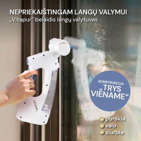 - Konstrukcija „trys viename“: purškia vandenį ir valiklį, valo ir siurbia langus.