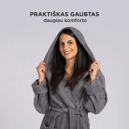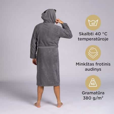 Infinity chalatas, pagamintas iš 100 % medvilninio frotinio audinio, yra puikus pasirinkimas po maudynių, plaukimo ar apsilankymo pirtyje, suteikiantis švelnumą ir jaukumą. Dėl tankaus audimo ir 380 g/m² audinio tankio jis yra itin sugeriantis, tačiau lengvai ir greitai džiūstantis. Chalatas turi praktišką gobtuvą ir dvi dideles kišenes, kurios apsaugo šlapius plaukus ir šildo rankas. Galimas rinktis 3 nuostabių spalvų, skalbiamas 40 °C temperatūroje.