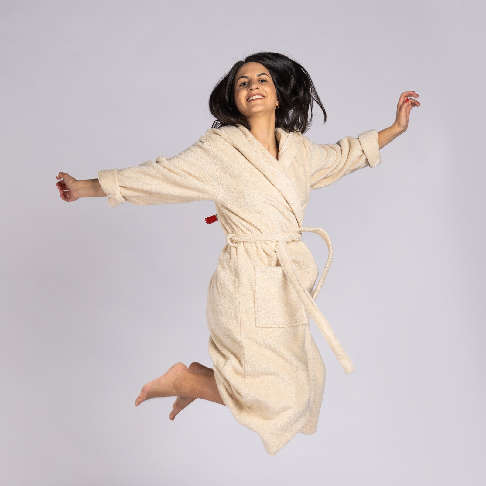 Dėl tankaus audimo ir 380 g/m² audinio tankio medžiaga pasižymi itin geru sugeriamumu, tačiau išlieka lengva ir greitai džiūstanti, kad jums būtų patogu. Be to, medvilnė yra nepaprastai švelni ir pralaidi orui, todėl su šiuo chalatu visuomet jausitės patogiai. Tai puikus pasirinkimas pirtims, SPA centrams, sporto salėms ar po dušo.