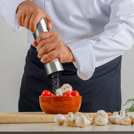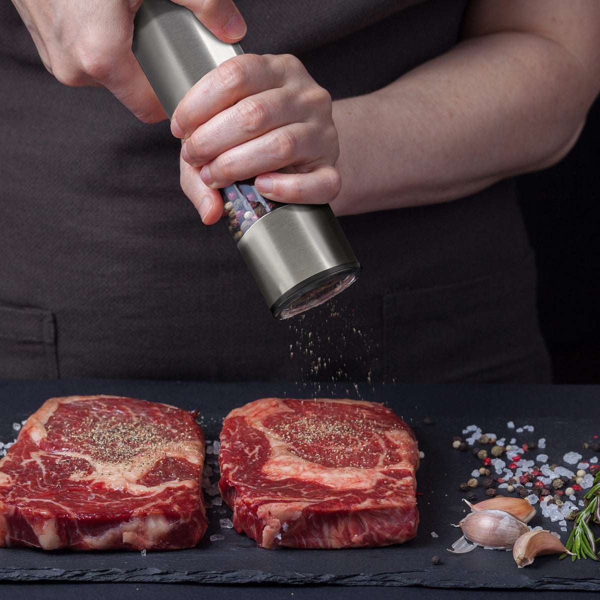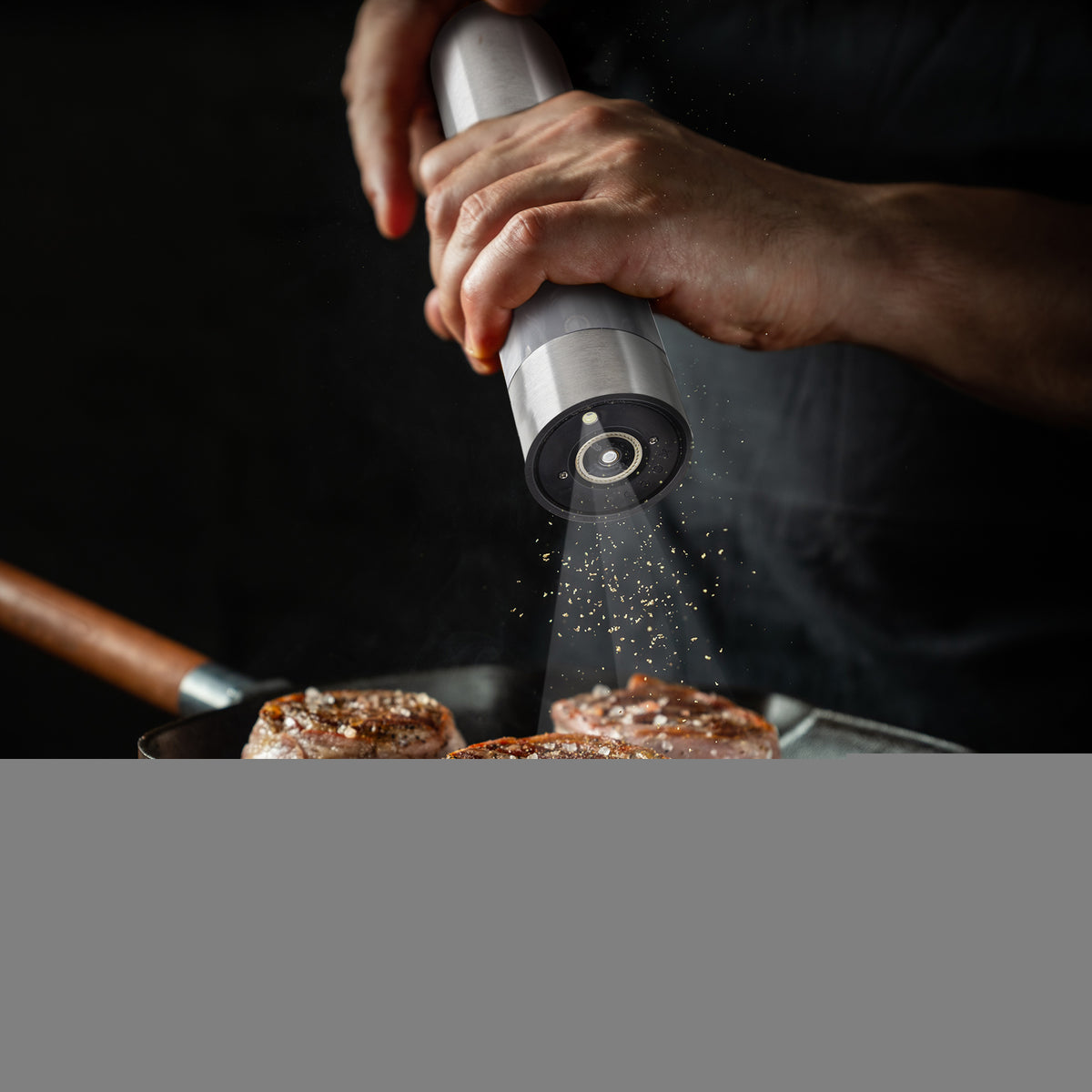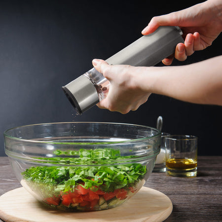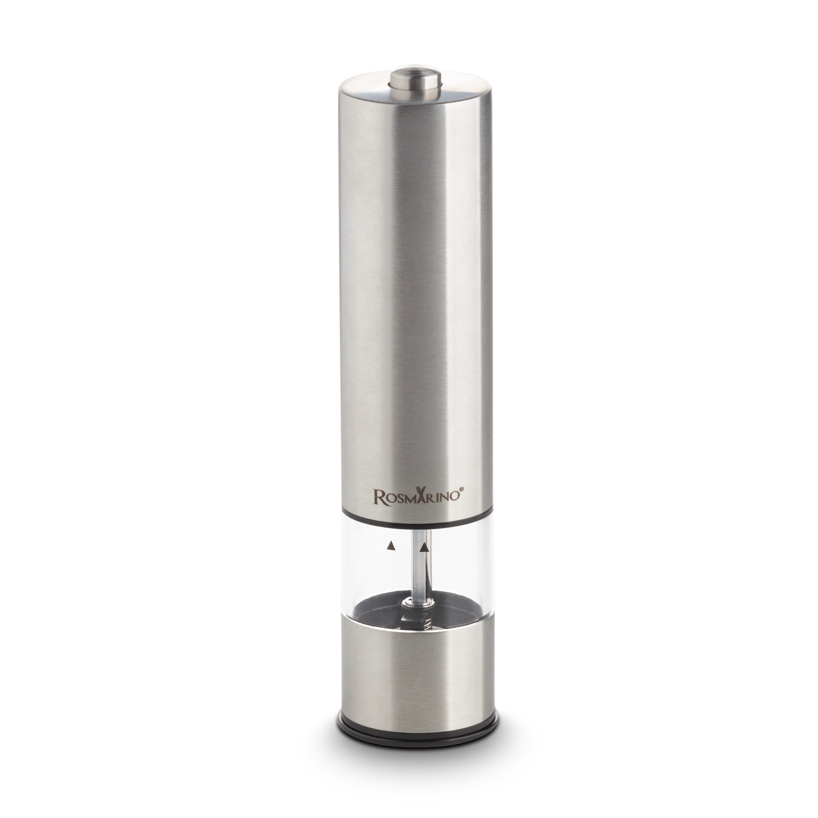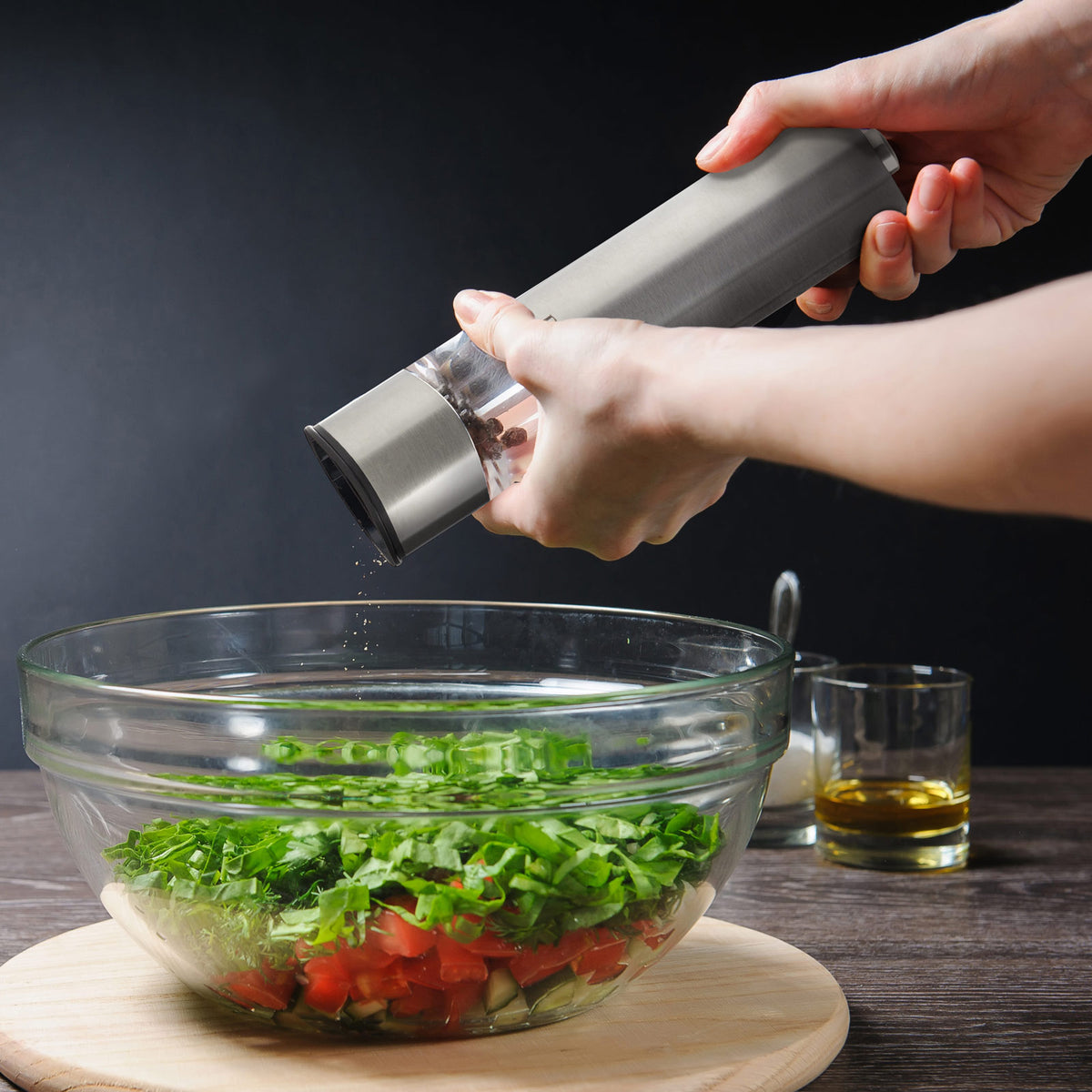 - Druskos arba pipirų malūnėlis ant baterijų, pagamintų iš nerūdijančio plieno.
