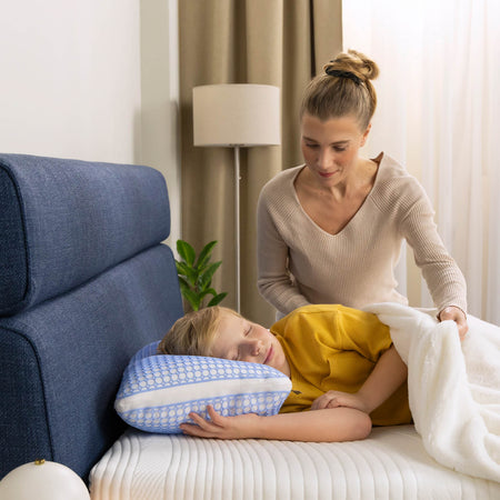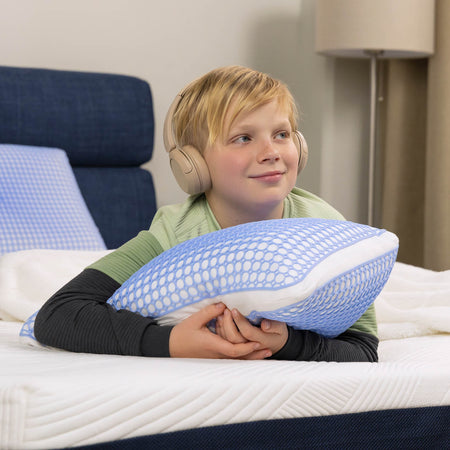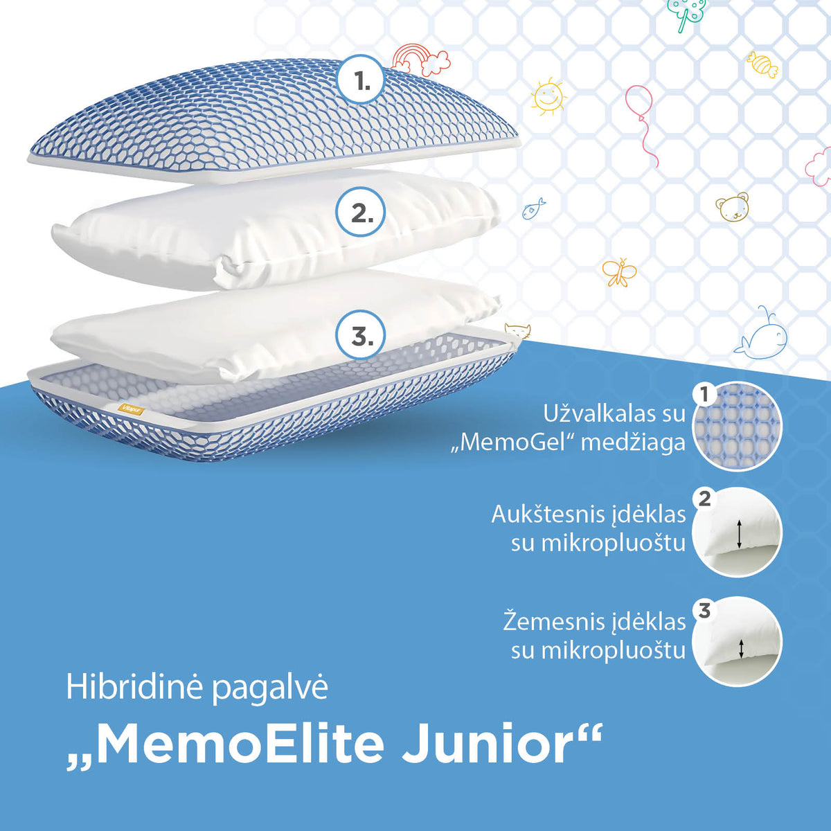 Hibridinė pagalvė MemoElite Junior – tai tobula pagalvė augantiems ir besivystantiems vaikams. Ji turi plonesnį ir storesnį įdėklą, leidžiantį lengvai reguliuoti pagalvės aukštį ir kietumą pagal vaiko amžių ir poreikius. Plonesnis įdėklas puikiai tinka mažesniems vaikams, kurių stuburas dar vystosi ir reikalauja tik minimalios atramos, o storesnis įdėklas labiau tinka vyresniems vaikams, kuriems reikia didesnės atramos miego metu. Mikropluošto užpildas įdėkluose mažina spaudimą kaklui ir pečiams, tuo pačiu švelniai bei minkštai palaikydamas galvą, užtikrinant komfortišką ir atpalaiduojantį miegą. Inovatyvi MemoGel medžiaga užtikrina ypač gaivią ir sausą miego aplinką, suteikdama puikią atramą ir pagerintą oro pralaidumą. Dėl tinklelio struktūros ši medžiaga efektyviai pašalina perteklinę šilumą ir neleidžia prakaituoti. Ši pagalvė tinka miegoti visose pozicijose ir auga kartu su vaiku – puikus pasirinkimas mažyliams, paaugliams ir jaunuoliams.