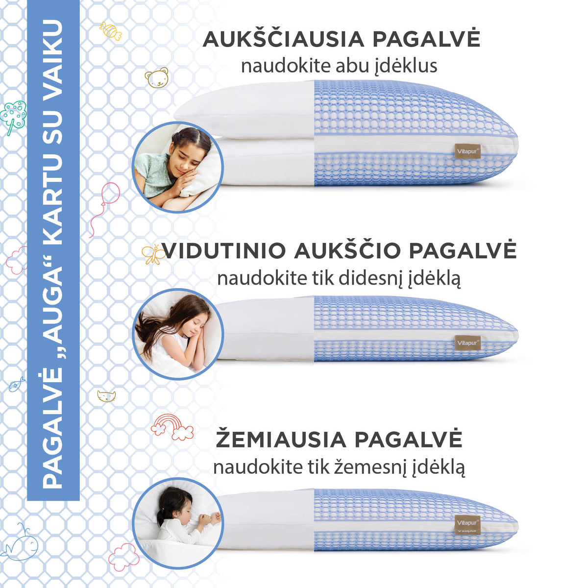 - Hibridinė vaikiška pagalvė su dviem įdėklais leidžia individualiai reguliuoti aukštį pagal skirtingus amžiaus etapus.