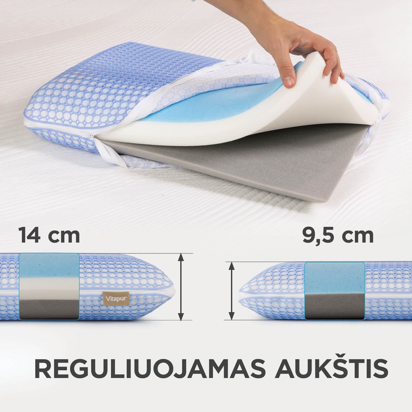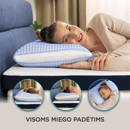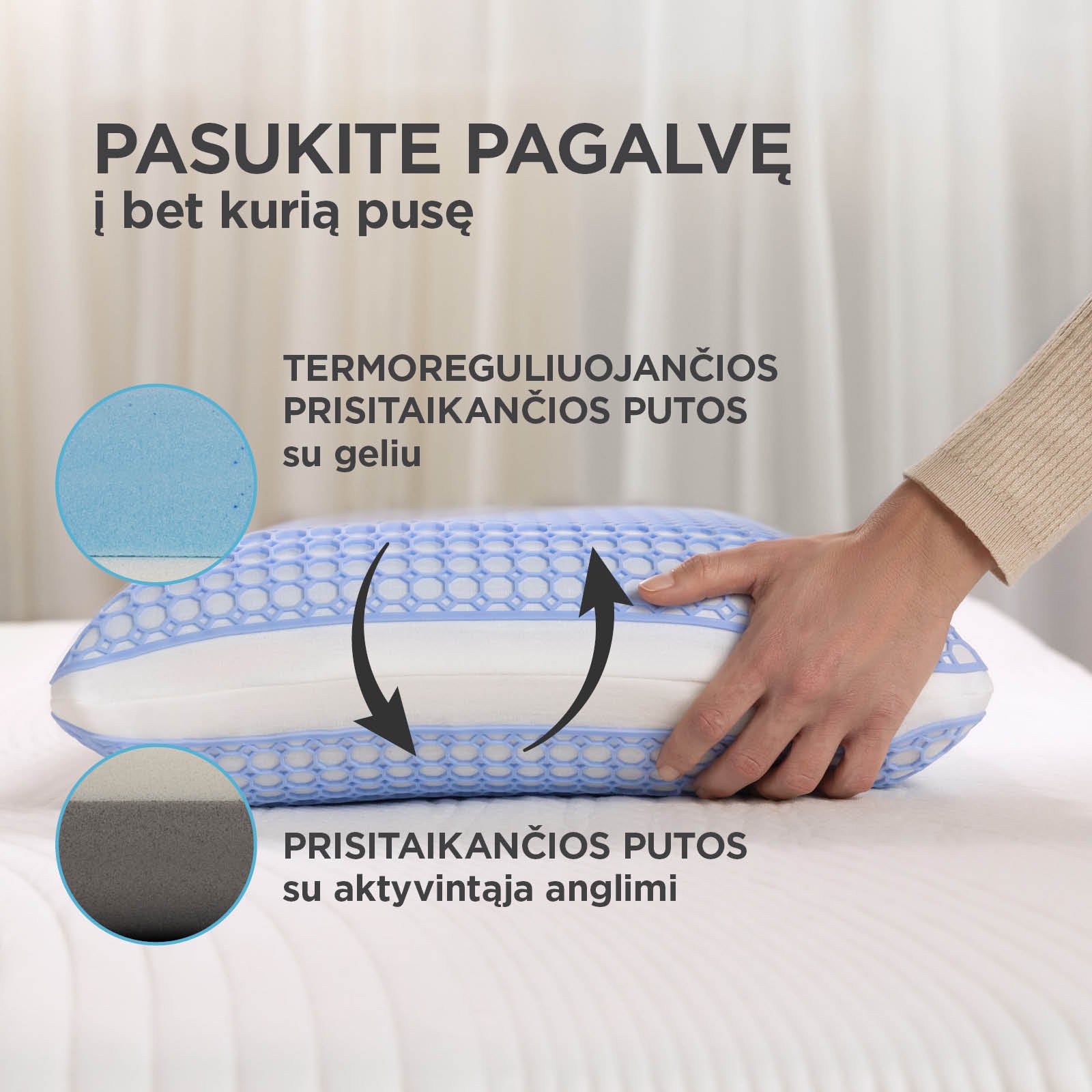 - Hibridinė 3 viename pagalvė su trimis aukštos kokybės atminties putomis reguliuojamam komfortui.