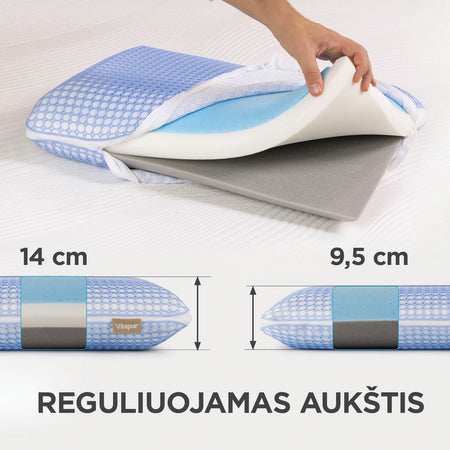 - Vidurinį atminties putos sluoksnį galima pašalinti, kad greitai būtų galima reguliuoti pagalvės aukštį.