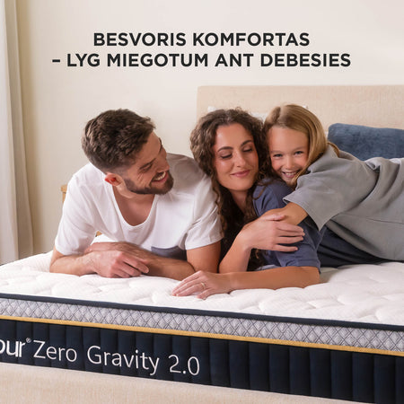 Patirkite, ką reiškia tikras lengvumo pojūtis – su inovatyviu ZeroGravity 2.0 čiužiniu. Kišeninės spyruoklės veiksmingai slopina judesius ir čiužinio keliamą garsą, kai vartotės miegodami. Kartu su švelniu užvalkalu tai sukuria pojūtį, tarsi sklandytumėte ore – be jokio judesio ar trikdžių. Šis čiužinys ypač tinka poroms ir tiems, kurie nori ramaus miego, net jei naktį dažnai keičia padėtį.