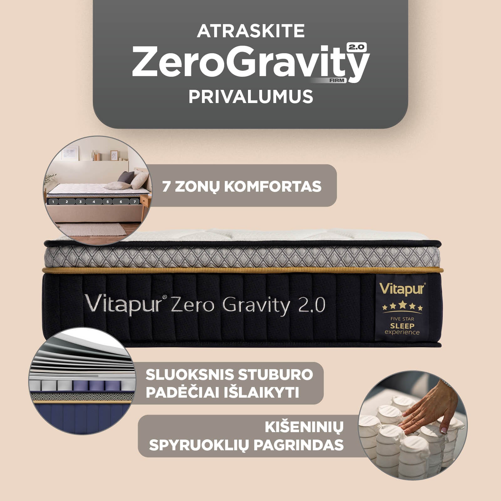 Hibridinis čiužinys Vitapur Zero Gravity 2.0 Kietas