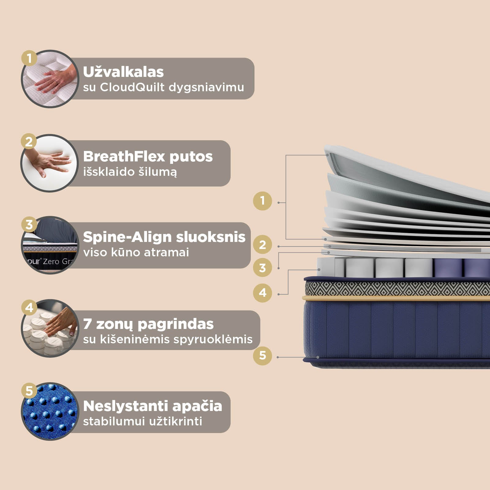 - Spine-Align sluoksnis palaiko taisyklingą stuburo padėtį visose miego pozose.