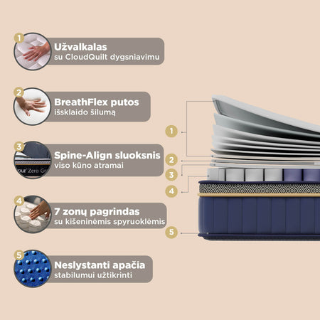 - Spine-Align sluoksnis palaiko taisyklingą stuburo padėtį visose miego pozose.