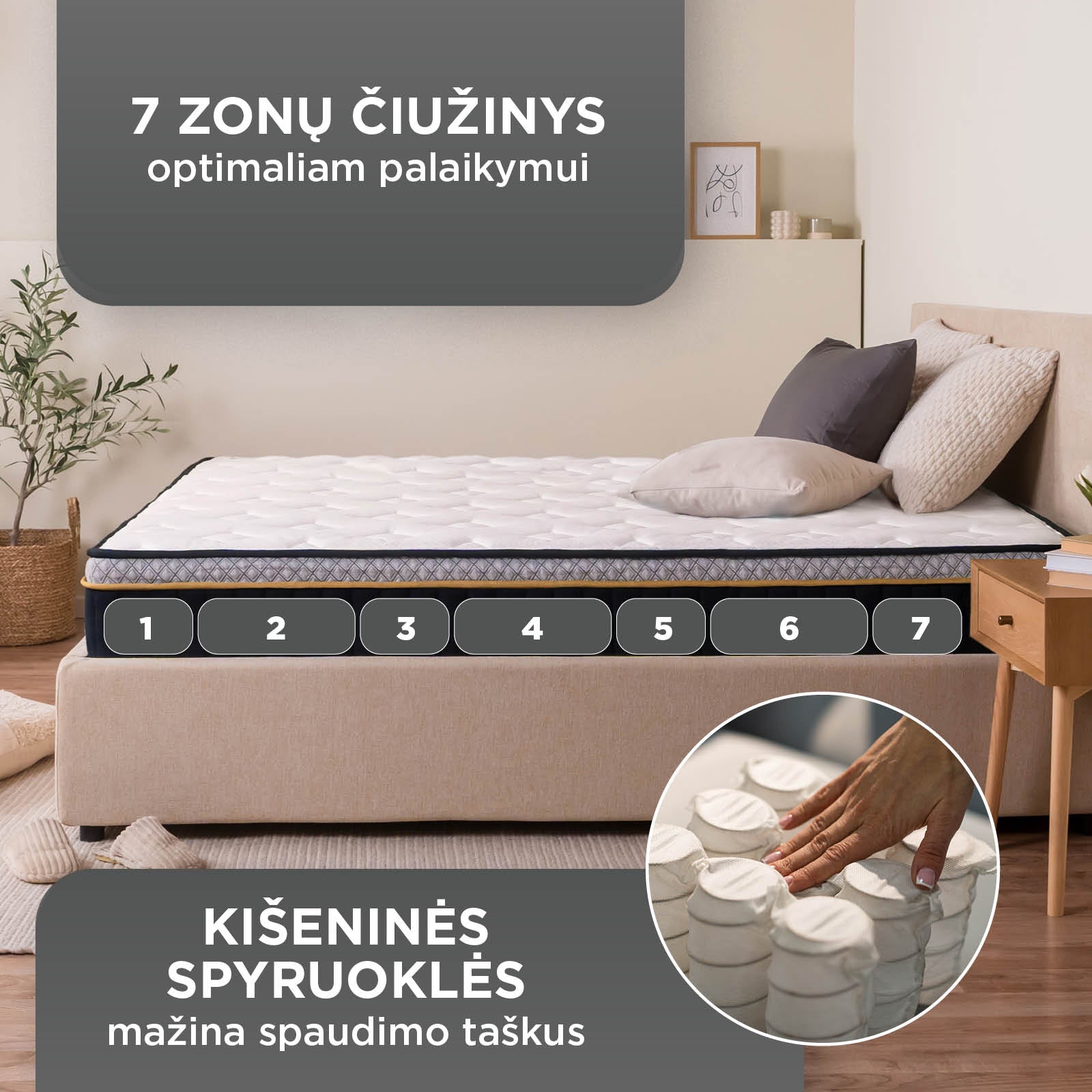 - 7 zonų hibridinis čiužinys suteikia tikslią atramą kiekvienai kūno daliai.