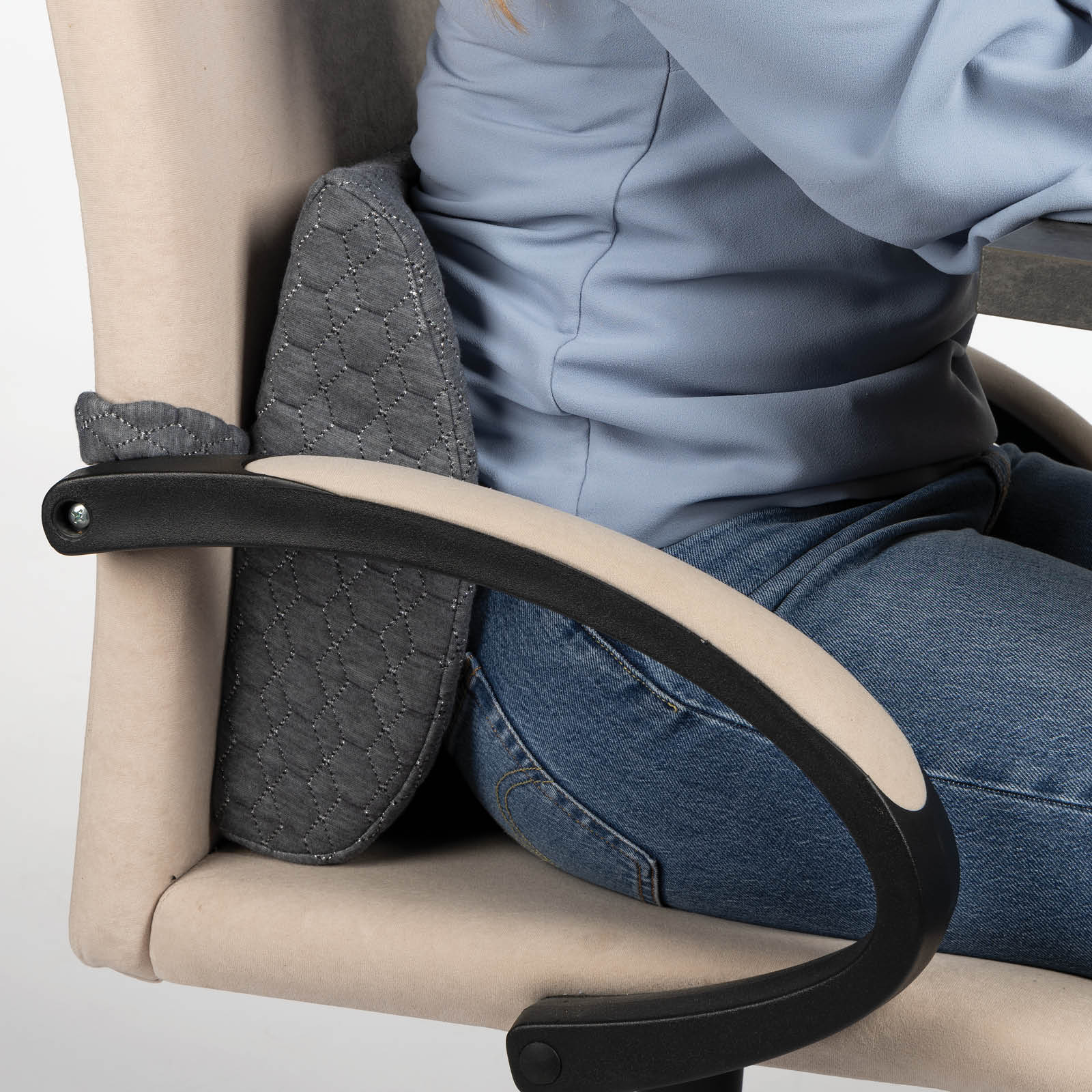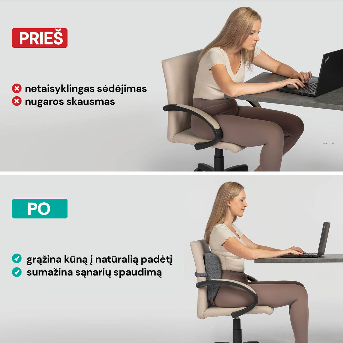 - Pagerina laikyseną sėdint prie darbo stalo, automobilyje ar namuose ant sofos.