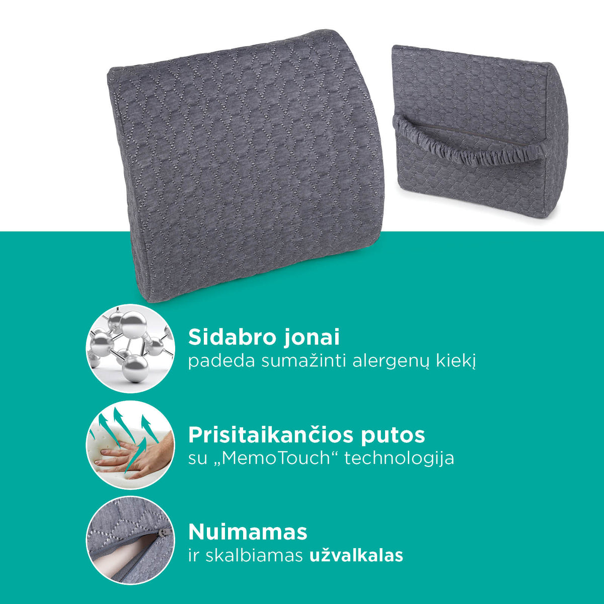 - Sidabro jonai efektyviai palaiko pagalvę švarią ir padeda išvengti alergijos simptomų bei odos sudirginimo.