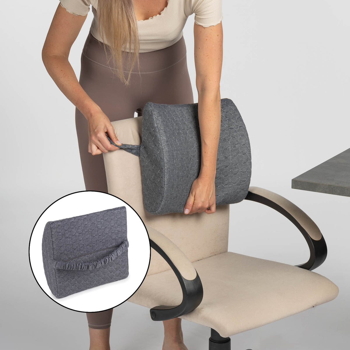- Pagalvė iš atminties putų prisitaiko prie natūralios stuburo formos, užtikrindama patogų sėdėjimą.