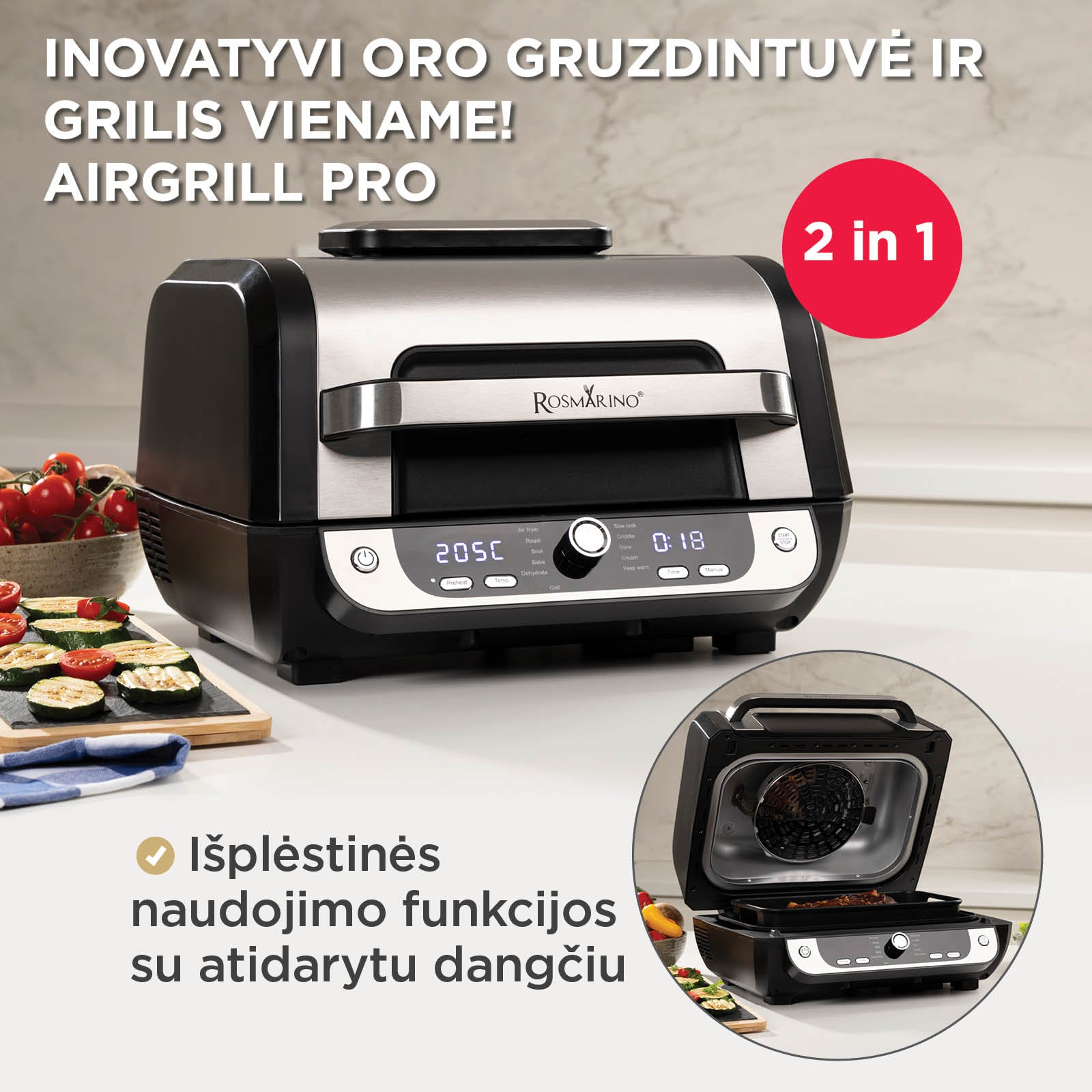 Pamirškite orkaitę, grilį, džiovyklę ir daugybę puodų. Karšto oro gruzdintuvė AirGrill Pro – tikras profesionalas jūsų virtuvėje! Su ja lengvai paruošite traškias bulvytes, gardžią vištieną, žuvį ar tobulai iškeptą kepsnį. Taip pat galėsite džiovinti vaisius sveikiems užkandžiams, garinti ar troškinti daržoves maistingam garnyrui bei pašildyti vakar dienos likučius. Ir svarbiausia – visi patiekalai gali būti gaminami su iki 85 % mažiau riebalų, todėl jie bus ne tik sveikesni, bet ir paruošiami greičiau!
