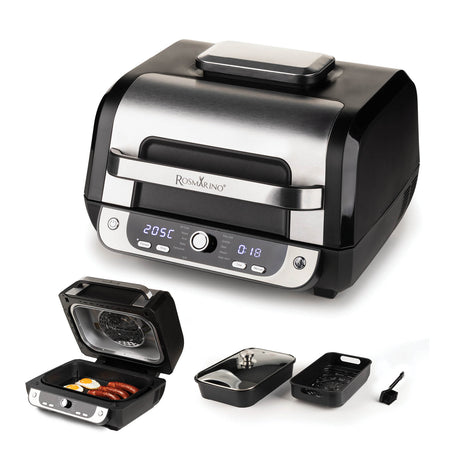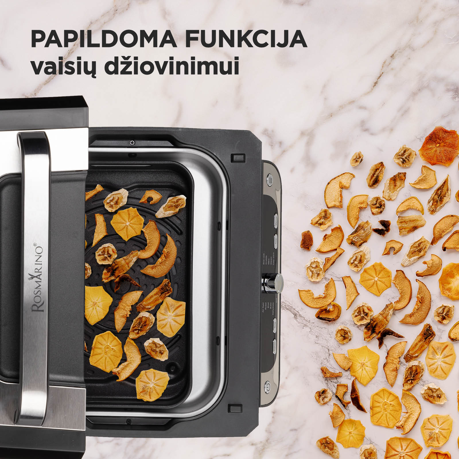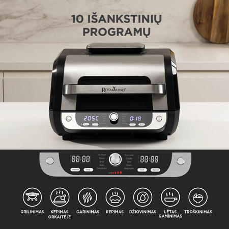 Karšto oro gruzdintuvė Rosmarino AirGrill Pro – tai aukštos kokybės virtuvės pagalbininkas, galintis pakeisti kelis įrenginius ir supaprastinti gaminimą. Su 10 iš anksto nustatytų programų galite lengvai paruošti traškias bulvytes, iškepti sultingą kepsnį ar pagaminti gardžius desertus bei garuose troškintas daržoves kaip sveiką garnyrą. Ši 1700 W galios gruzdintuvė turi viršutinį ir apatinį kaitinimo elementus, todėl kiekvieną kartą maistas iškepa tolygiai ir nepriekaištingai. 6 litrų talpa idealiai tinka šeimos pietums ar vakarienei su draugais. Valdymas itin paprastas – sukamasis valdiklis ir skaitmeninis ekranas užtikrina lengvą naudojimą. Rinkinyje taip pat yra lieto aliuminio kepimo indas ir stiklinis dangtis, kurie leidžia troškinti, garinti ar net lėtai virti atidengus. Šis universalus įrenginys susitvarkys su beveik bet kokiu gaminimo iššūkiu ir padės pasiekti profesionalų rezultatą kiekvieną kartą.
