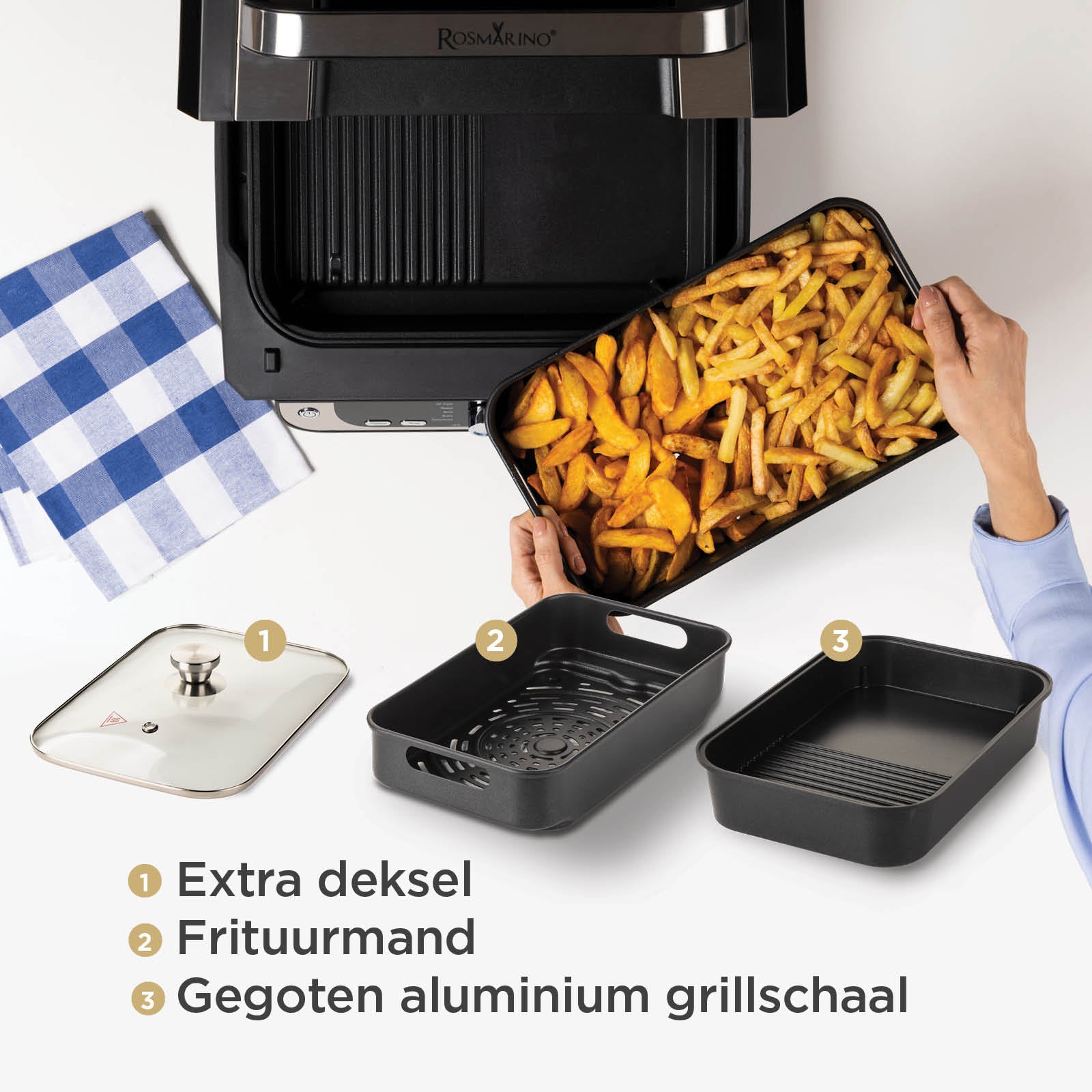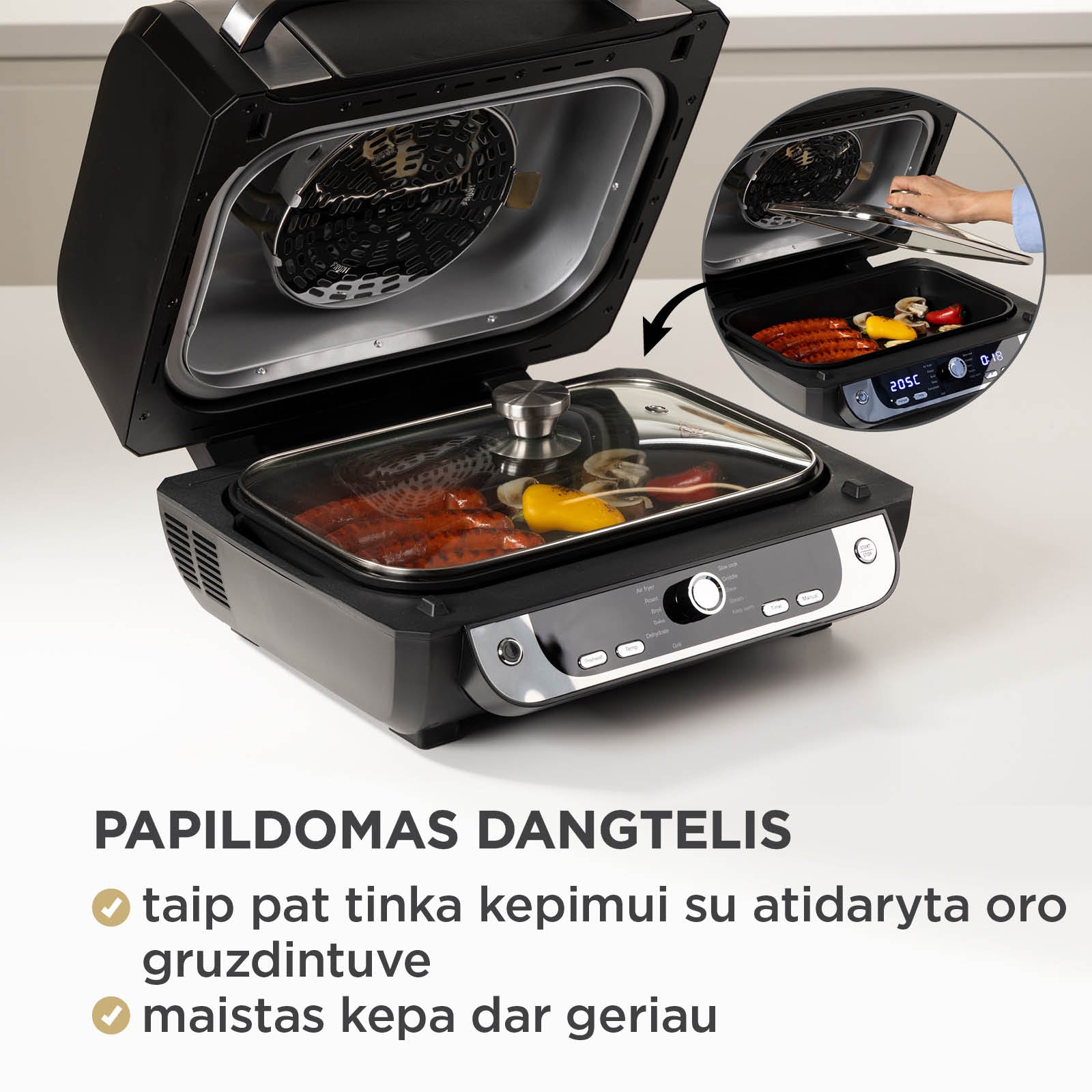 AirGrill Pro karšto oro gruzdintuvė komplektuojama su lieto aliuminio kepimo indu ir stikliniu dangčiu. Tai reiškia, kad galite naudoti gruzdintuvę ir su atidengtu dangčiu – garinimui, lėtam virimui ar troškinimui.