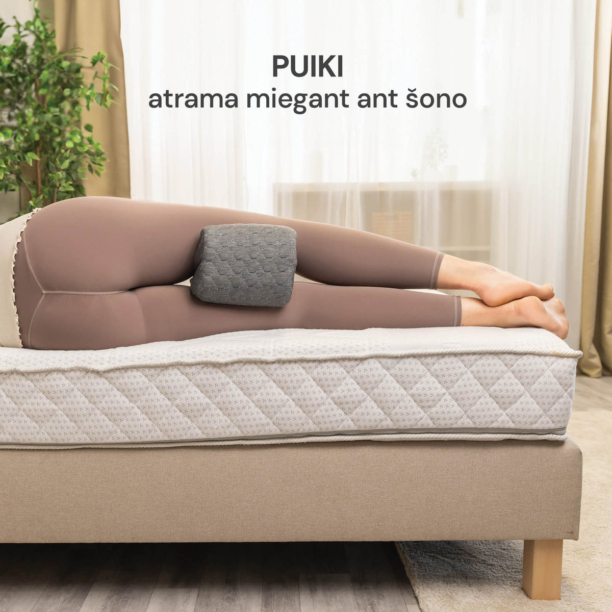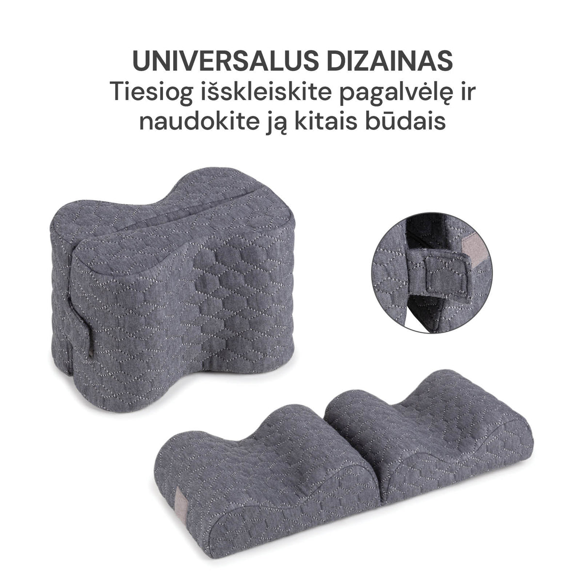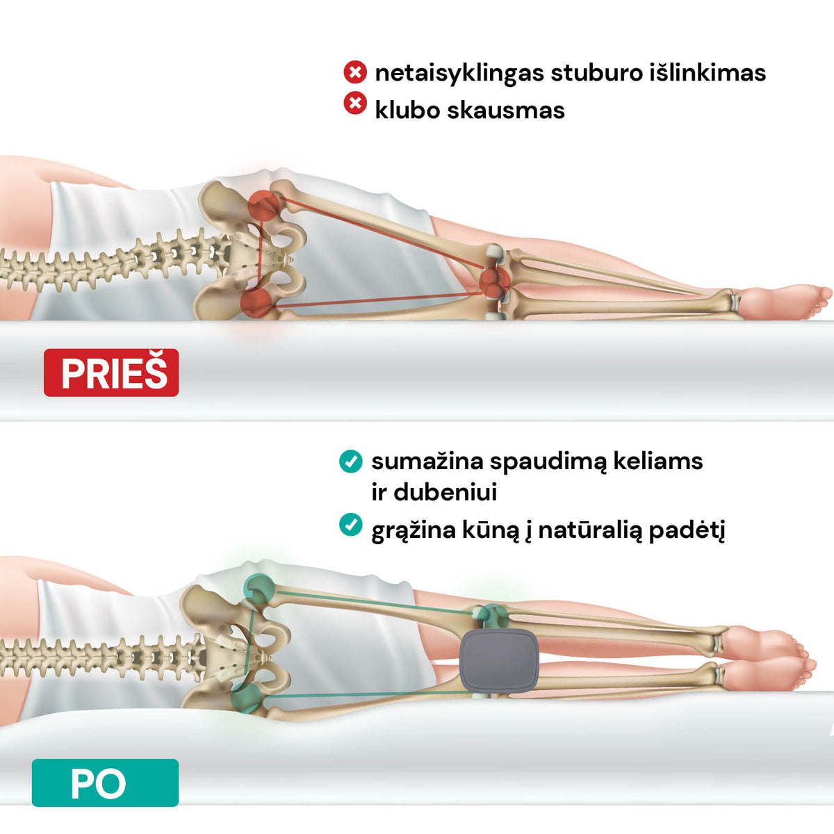 - Ergonomiška pagalvės forma keliams padeda palaikyti tinkamą stuburo padėtį ir sumažina spaudimą keliams, apatinei nugaros daliai ir klubams.