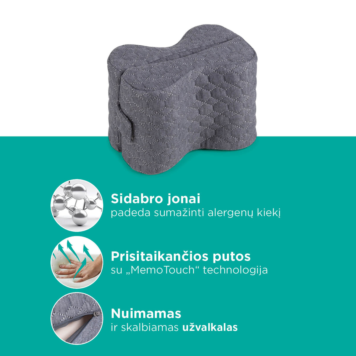 MemoSilver VitaSpine kelių pagalvė yra puikus sprendimas šoniniams miegotojams ir tiems, kurie nori sumažinti klubų, kojų ir apatinės nugaros dalies skausmą. Suprojektuota taip, kad patogiai tilptų tarp kelių, ji palaiko natūralų stuburo išlygiavimą gulint. Taip pat padeda sumažinti sąnarių ir dubens spaudimą, palengvindama skausmą miego metu. Su savo ergonomiška forma ir optimaliu palaikymu ji taip pat idealiai tinka nėščioms moterims ir atsistatymui po operacijos. Inovatyvios MemoTouch atminties putos puikiai prisitaiko prie kūno, suteikdamos reikalingą palaikymą patogiam poilsiui.
