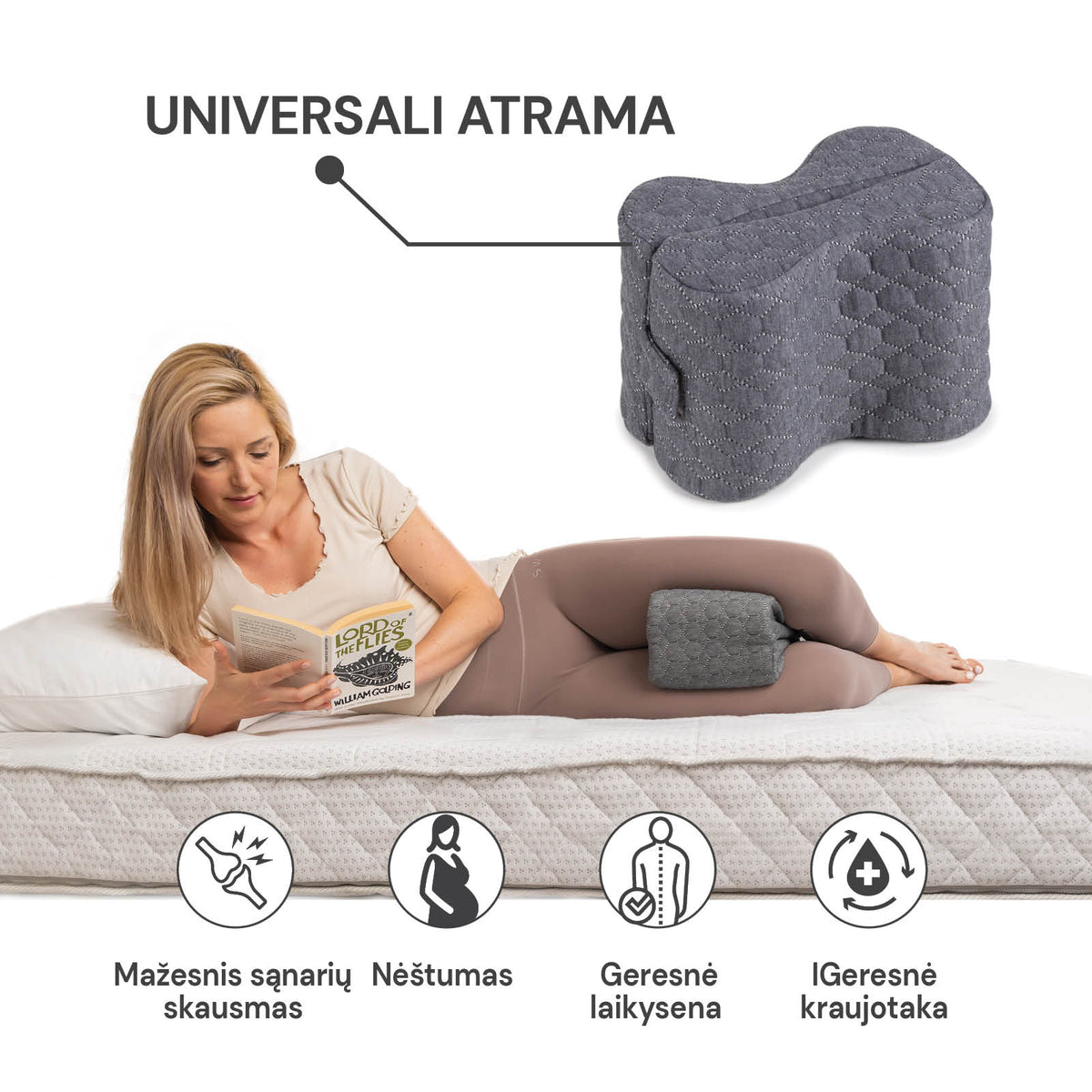 - Ergonomiška pagalvė keliams sumažina spaudimą keliams ir dubeniui, išlaikant kūną natūralioje padėtyje.