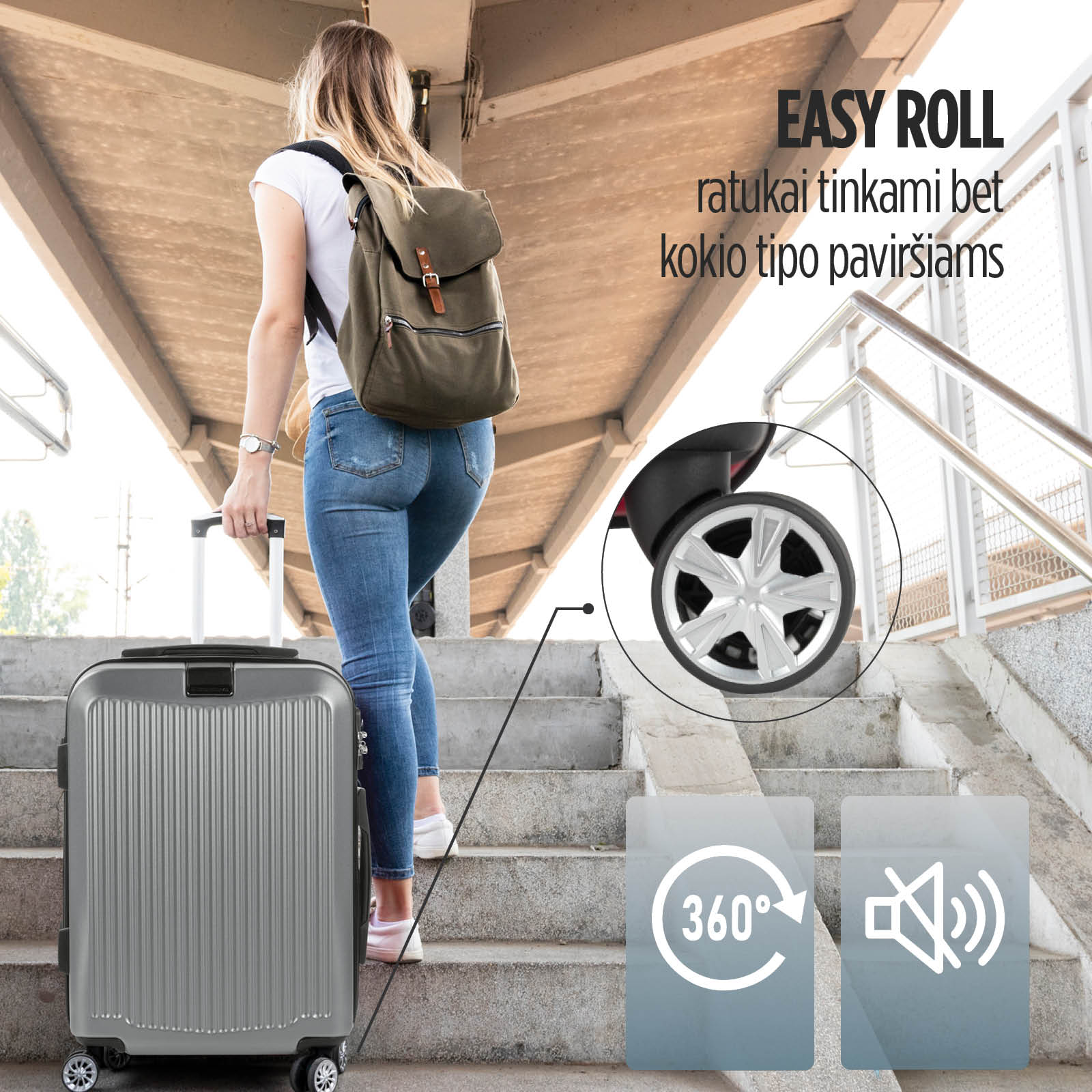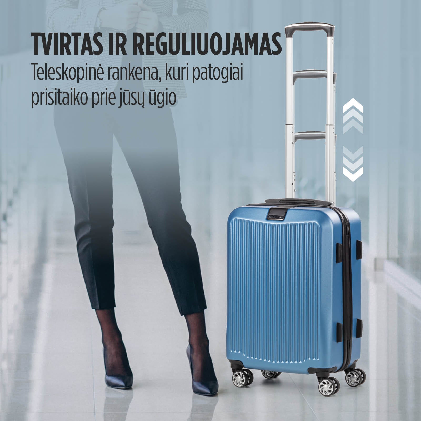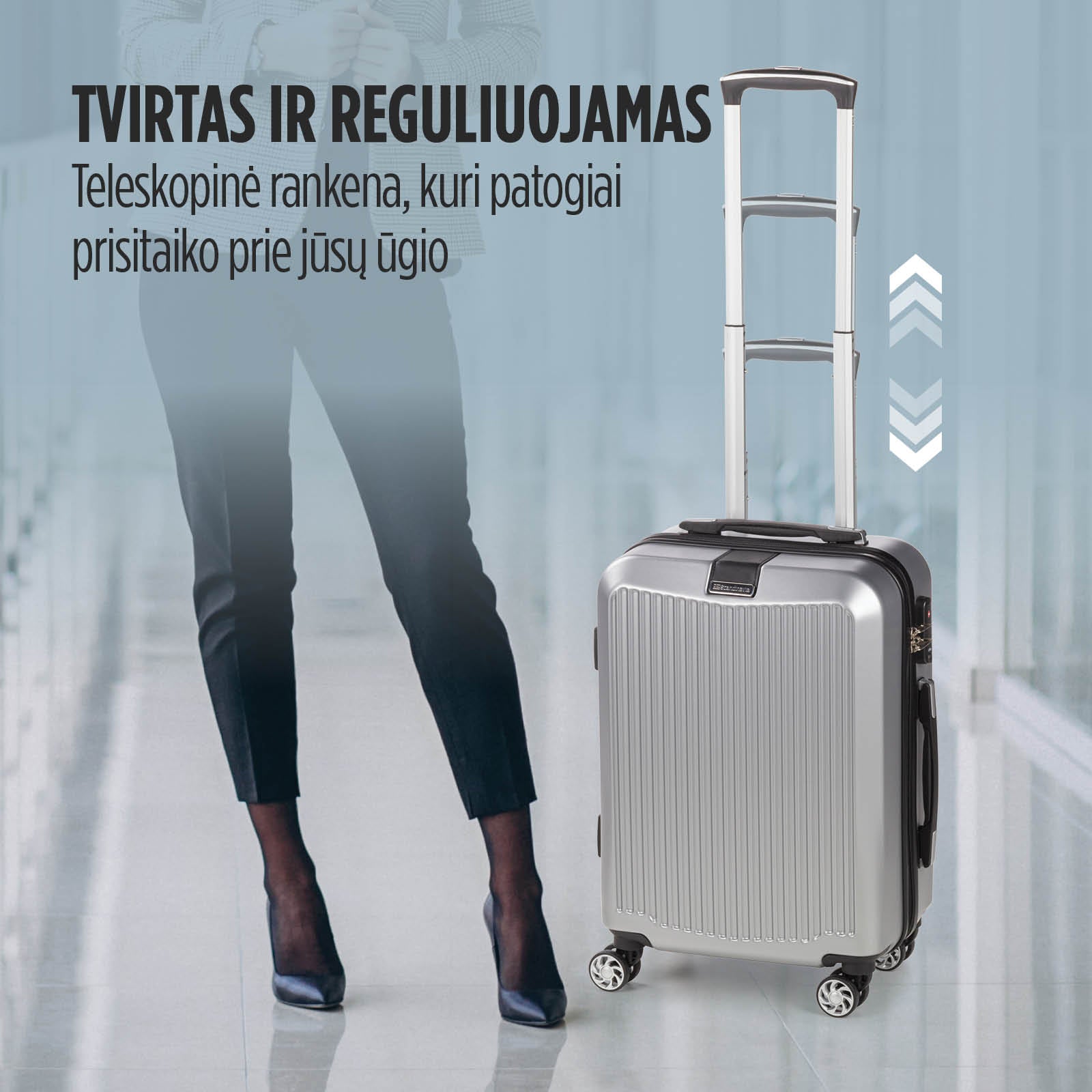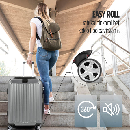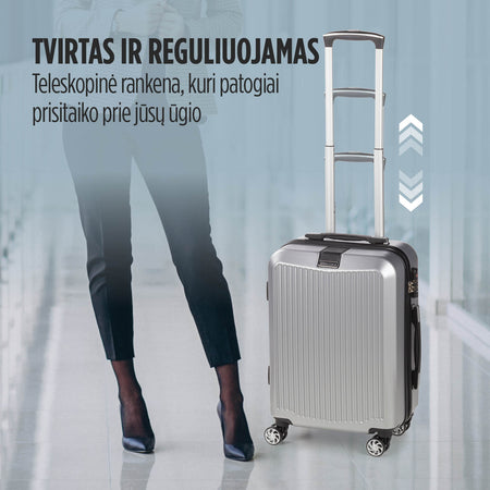 4 dvigubi 360° besisukantys ratukai leidžia tyliai ir saugiai riedėti bet kuria kryptimi, neužstrigdami. Jo išskirtinis praktiškumas atsispindi reguliuojamoje teleskopinėje rankenoje, kuri leidžia lengvai transportuoti net ir sunkiausią bagažą. Lengvai sureguliuokite jį į reikiamą aukštį.